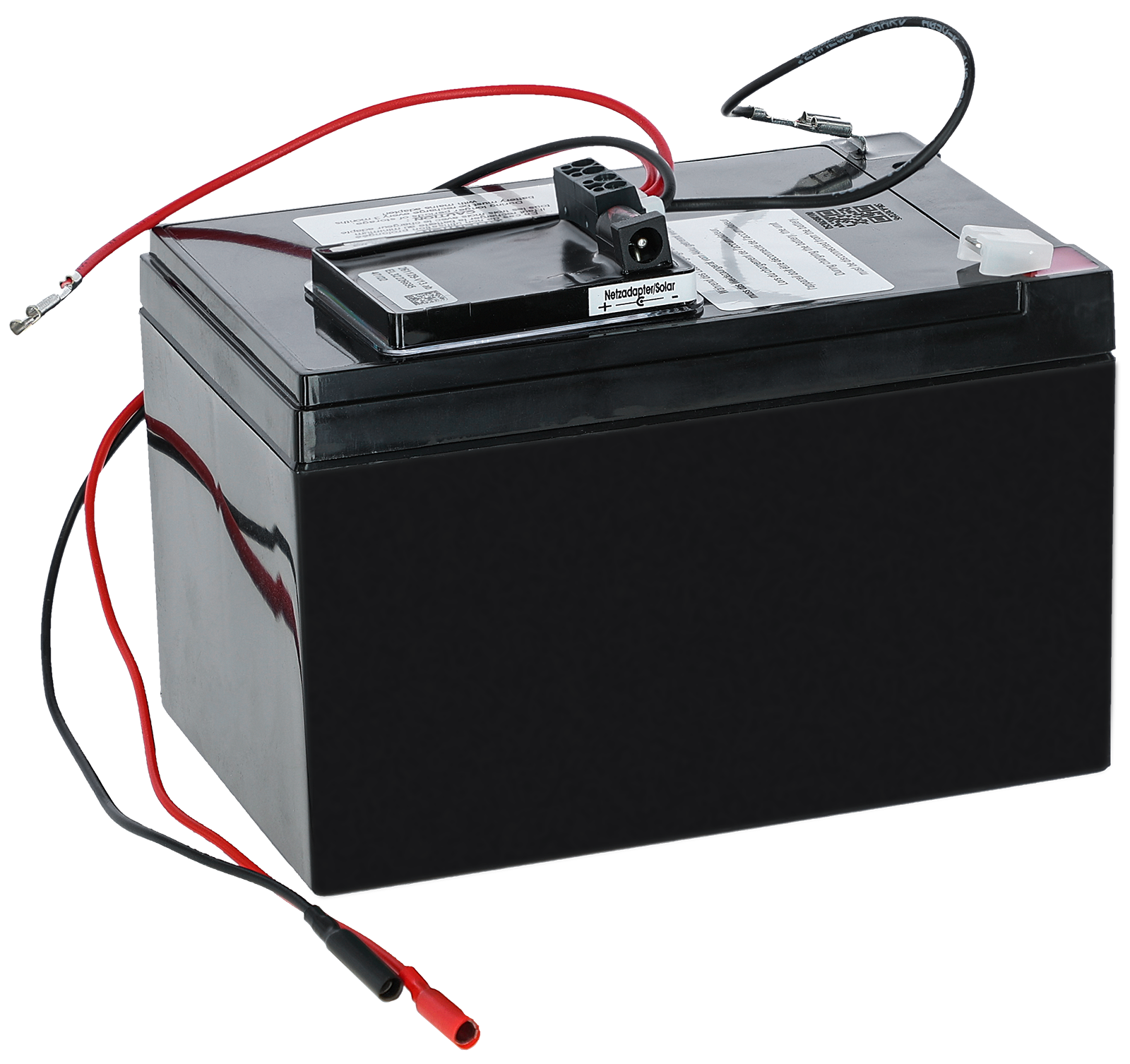 für alle 9 Volt Geräte, die auch für den 12 Volt Betrieb ausgelegt sind. Wiederaufladbarer AGM-Akku 12 V, 15 Ah. Aufladbar mittels mitgeliefertem Netzteil. 150 x 100 x 115 mm (LxBxH)