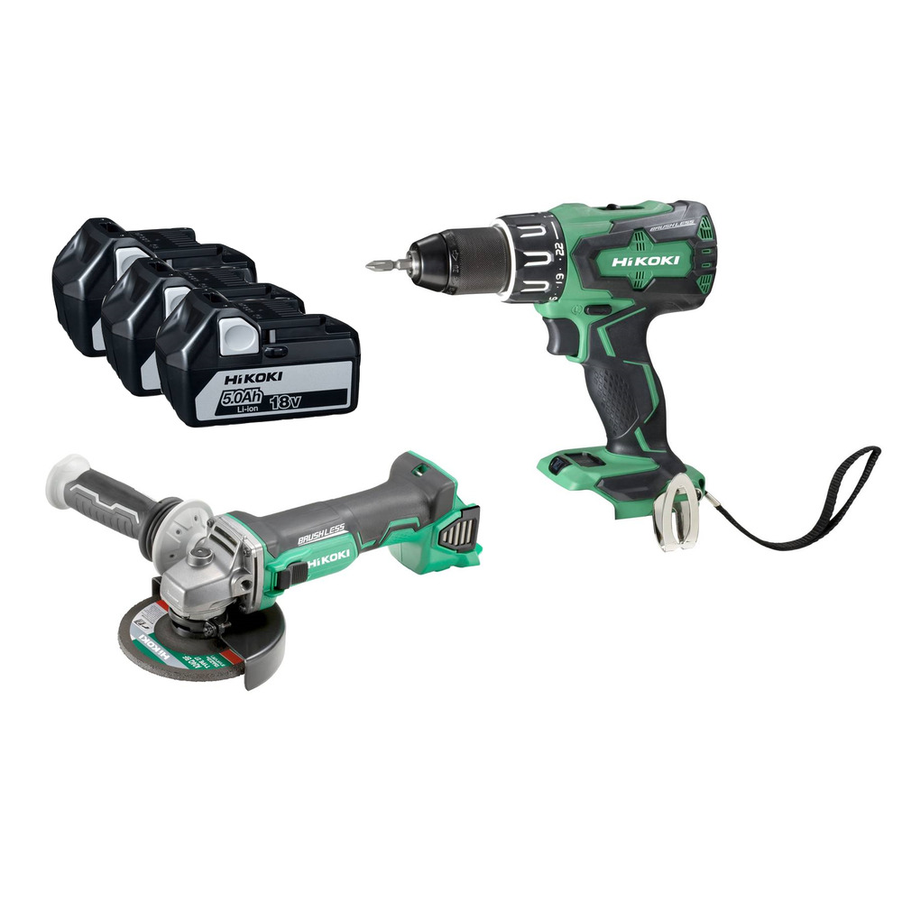 Profi-Akku-Maschinenset mit Schlagbohrschrauber DV18DBS mit 2-Gang-Getriebe und Bürstenlosen Motor für Drehmoment bis 70 Nm. Durch Schlagfunktion in allen Materialien einsetzbar. Akku-Winkelschleifer G18DBL 125 mm mit bürstenlosen Motor für hohe Leistung und lange Lebensdauer. Komplett Set mit den 2 Maschinen, 3x Li Akku 18 V / 5,0 Ah, Ladegerät und zwei passenden HIK-Systemkoffer.
