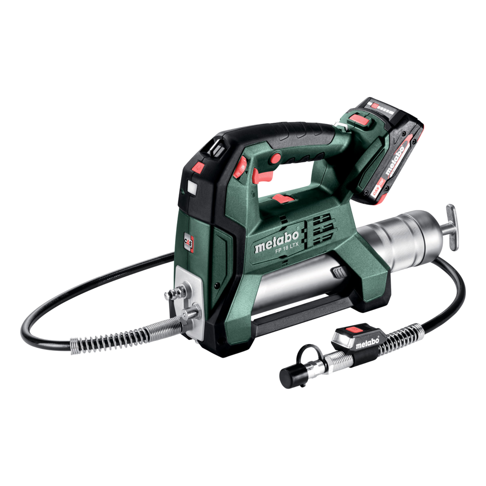Profi Akku-Fettpresse mit 2 Arbeitsstufen für Auspressdruck bis 690 bar. Die Auspressmenge ist in 10 Stufen einstellbar. Die Presse kann mit Direktbefüllung, Gebinde oder 400 g Standard Fettkartuschen befüllt werden. Keine Luft im Fettraum durch integriertes Entlüftungsventil, optimales Arbeiten durch langen (1200 mm) Schlauch und LED-Lampen am Gerät und beim Mundstück, Magnet und Schultergurt für komfortables Arbeiten. Komplett mit 2x Akku 18 V/2,0 Ah, Ladegerät und Metabox-Systemkoffer.