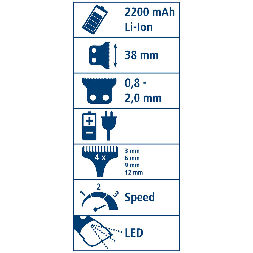 Akkuschermaschine für die Detailschur, mit 3-stufiger Schergeschwindigkeit und hervorragenden Schereigenschaften durch Edelstahl-Scherkopf. Mit hochwertigem, langlebigem Motor, starkem Li-Ion Akku mit 2200 mAh, mit digitaler Anzeige des Ladezustands, ölen, reinigen sowie Restkapazität des Akkus und eingebautem Licht für bessere Sicht beim Scheren. Kann auch mit angestecktem Netzteil betrieben werden, 5-stufige Schnitthöheneinstellung mittels Stellrad (0,8 - 2,0 mm),inkl. umfangreichem Zubehör mit 4 Aufsteckkämmen (3, 6, 9 ,12 mm), Reinigungsbürste, Netzteil und Ladeschale, Bedienungsanleitung, Öl. Technische Daten: 4000/5000/6000 Hübe/min., Lade- und Schurzeit ca. 300 min., Gewicht ohne Kabel 242 g.