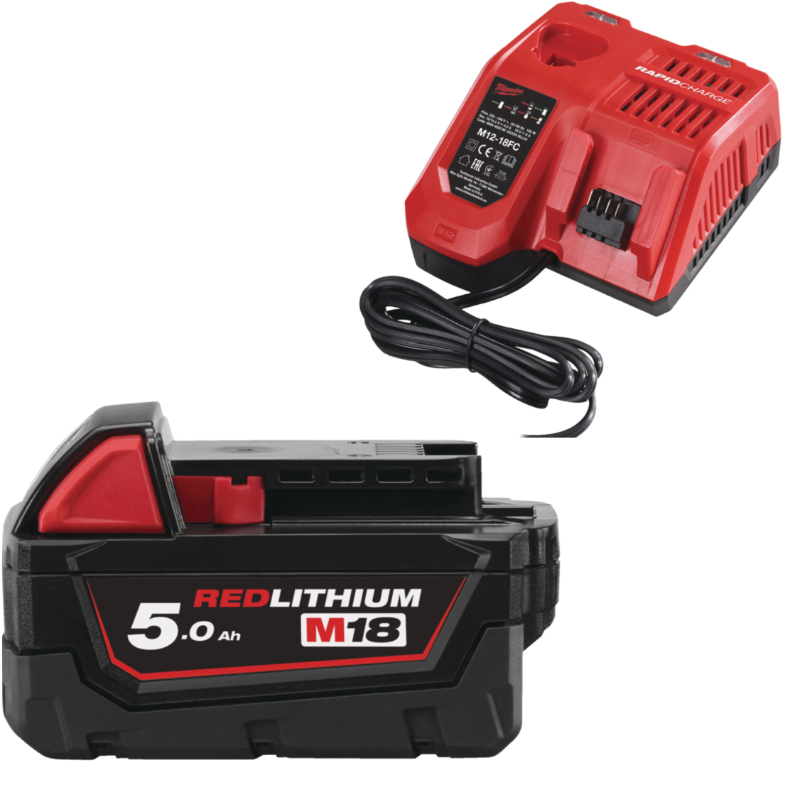 Set besteht aus Universal Ladegerät M12-18FC für 18 V und 12 V Milwaukee Akkus und einen 18 V / 5,0 Ah Akku.