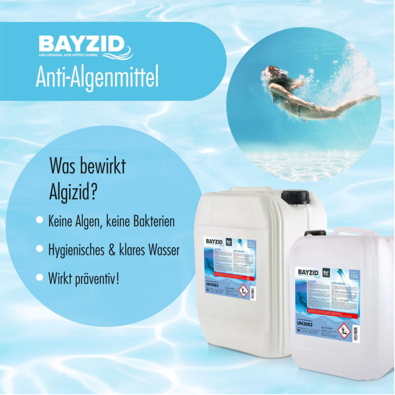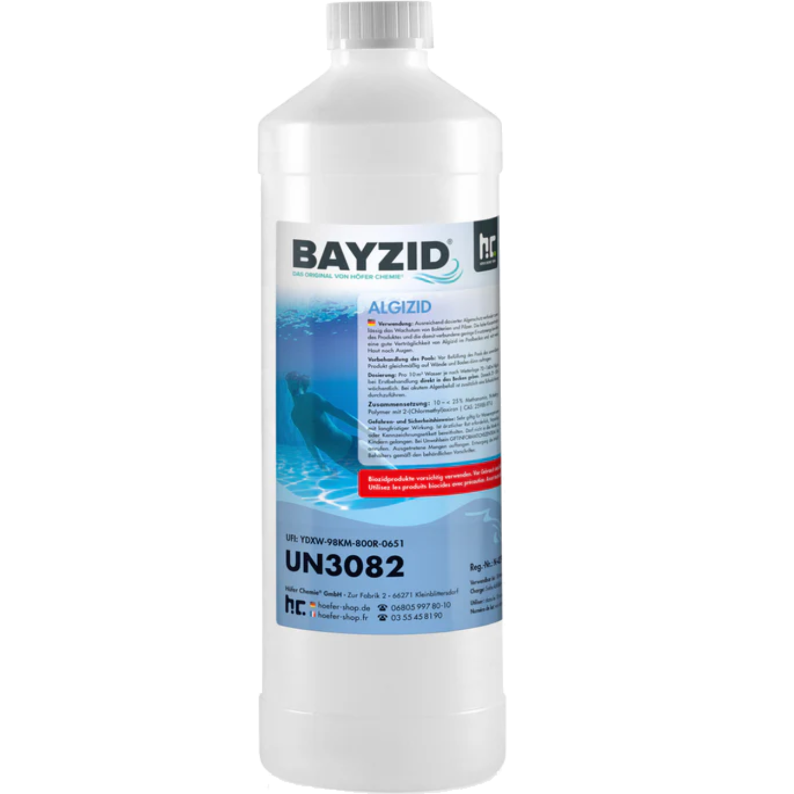 Zuverlässiger Schutz vor Algen, Bakterien und Pilzen, halten Sie Ihr Schwimmbecken frei von Algen, Bakterien und Pilzen mit diesem hochwertigen 1-Liter-AlgizidMit dem 1-Liter-Algizid von Höfer Chemie erhalten Sie ein hochwertiges Mittel zur effektiven Vorbeugung gegen Algenbildung in Ihrem Schwimmbecken. Das BAYZID® Algizid hemmt das Wachstum von einzelligen und mehrzelligen pflanzlichen Mikroorganismen, deren Ausbreitung durch Sonnenlicht, Phosphate, Staub, Regen und Wind begünstigt wird. Zusätzlich wirkt es gegen Bakterien und Pilze und sorgt so für dauerhaft klares, hygienisch sauberes Wasser.Dosierungshandhabung:Pro 10m³ Wasser je nach Wetterlage 70-140 ml Algizid Algenverhütung bei Erstbehandlung direkt in das Becken geben. Danach 25-50 ml wöchentlich.Bei Ersteinfüllung hat sich bewährt, die Wände und den Boden mit Algizid einzureiben und ca. 1 Std zu warten, bis der Pool befüllt wird.Gewissenhaft für das reine SchwimmvergnügenDer Verbreitung von Algen, Bakterien und Pilzen in Ihrem Schwimmbecken wird mit dem zuverlässigen 1 L Algizid ein Ende gesetzt.Bereits nach der ersten Anwendung merken Sie den Unterschied und kommen in den Genuss sauberen und reinen Wassers.Alles über 1 L Algizid Algenverhütung: