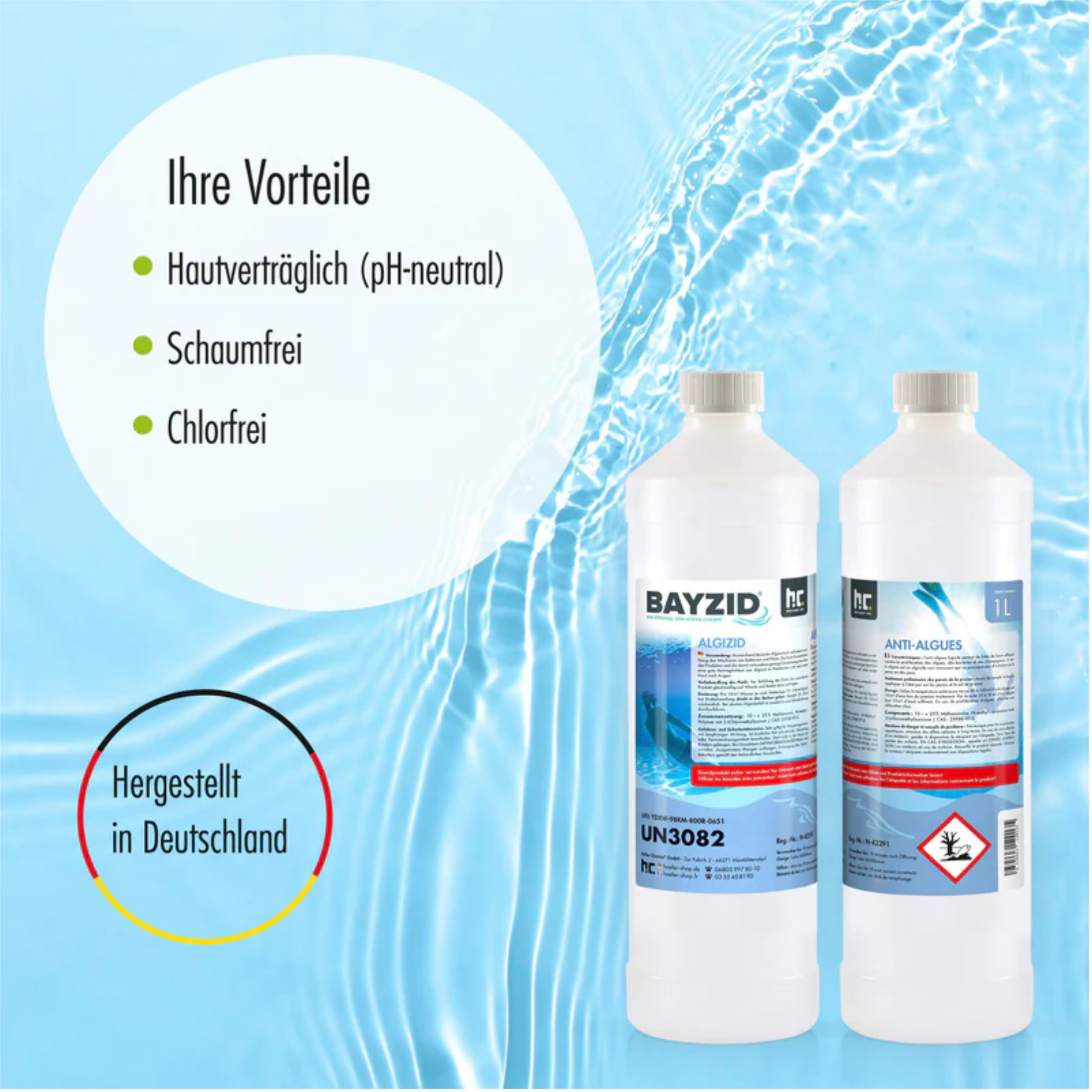1-Liter- Algizid Algenverhütung von BAYZID ® ist ein Qualitätsprodukt und wurde in Europa hergestellt.Mit seinen chlorfreien und reizarmen Eigenschaften bietet er Ihnen bedenkenlosen Schutz.Außerdem ist er frei von Schaum.Achtung ! H302: Gesundheitsschädlich bei Verschlucken. H319: Verursacht schwere Augenreizung. H335: Kann die Atemwege reizen. H410:Sehr giftig für Wasserorganismen mit langfristiger Wirkung.Biozidprodukte vorsichtig verwenden. Vor Gebrauch stets Etikett und Produktinformationen lesen.Weitere Informationen:Biozid Registrierungsnummer: N-42291Gefahrenklasse: 4.1: WassergefährdendKindersicherheitsverschluss: NeinLagerung: Frostgeschützt, im Original Gebinde, kühl und trocken lagernHaltbarkeit: 18 Monate nach Öffnung