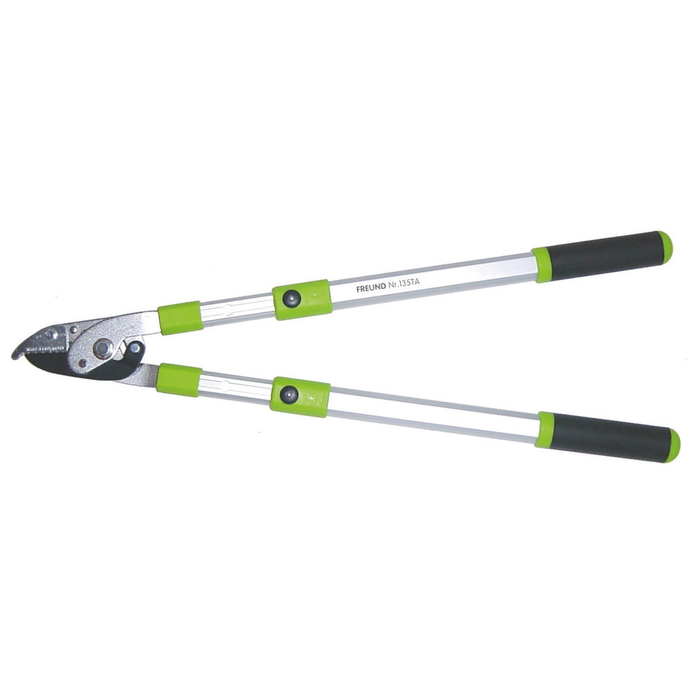 Amboss-Astschere mit 5-fach verstellbaren Teleskopgriffen. Die leichten Aluminiumgriffe verfügen über einen Kälteschutz, was das Arbeiten im zeitigen Frühjahr besonders angenehm macht.
