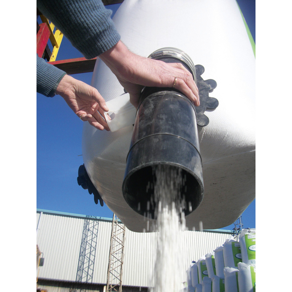 Praktischer Auslauf mit wieder verschließbaren Schieber zum kontrollierten Entnehmen von fließenden Materialien wie Futter, Düngemittel, Saatgut usw. Einfache Montage an jeden Big Bag. Die integrierte Klinge schneidet bei der Montage das entsprechende Loch selbstständig in den gefüllten oder leeren Bag. Durch das abnehmbare und bewegliche Rohr ist ein einfaches Befüllen von kleineren Säcken, Schiebetruhen usw..problemlos möglich. Gesamtlänge Schlauch und Rohr 600mm, Rohrdurchmesser 105mm.