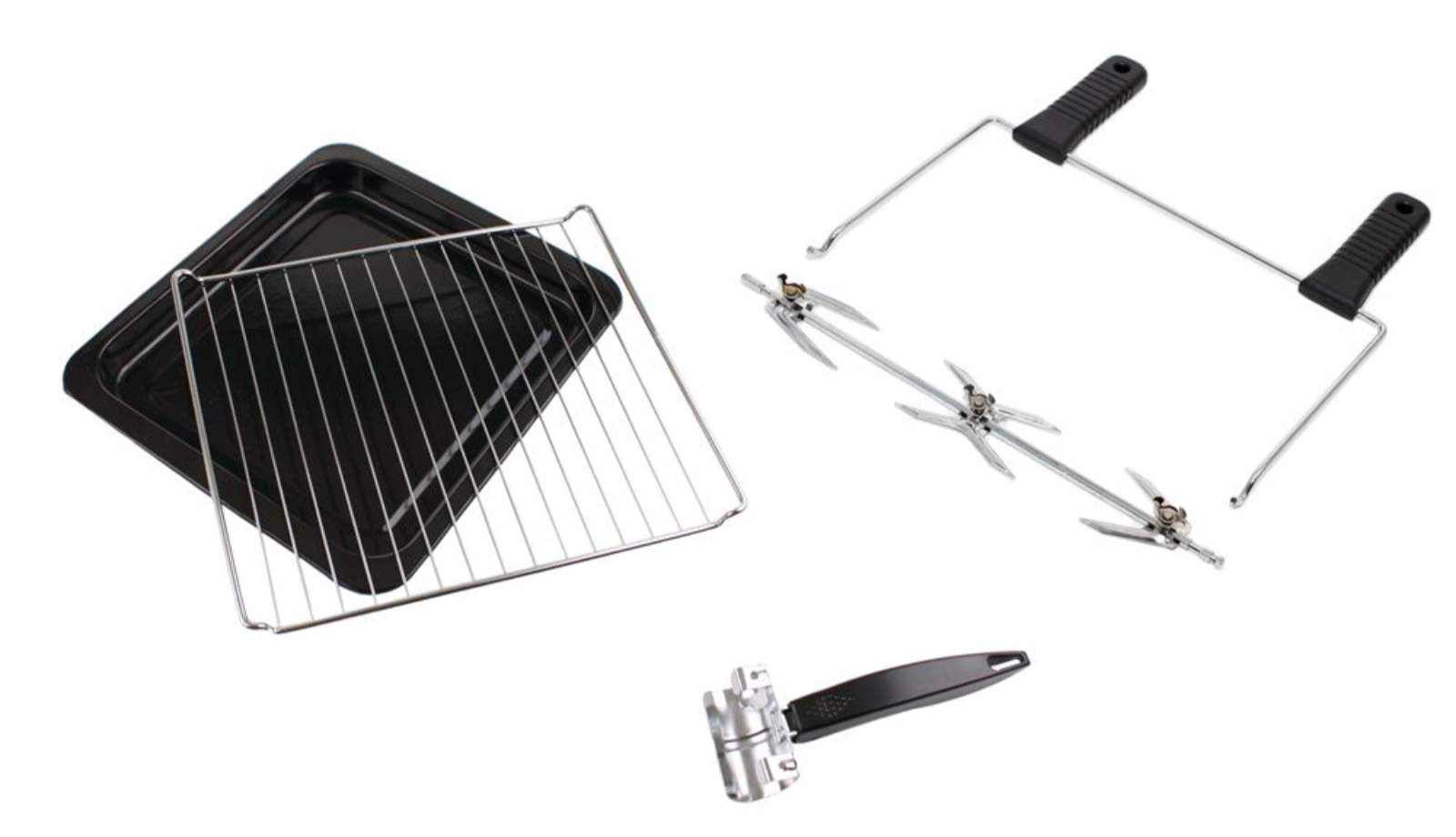 - Inklusive: Drehspieß-Garnitur mit separatem Griff, emailliertes Brat-/Backblech mit separatem Handgriff, verchromter Grillrost, entnehmbares Krümelblech