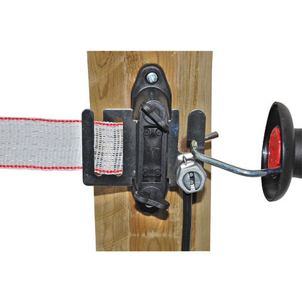 Robuster Bandisolator mit Anschlussplatine aus Edelstahl, zum Einhängen von Torgriffen, als Anschlussmöglichkeit zwischen Zaunanfang und Weidezaungerät oder für Abzweigungen im Zaun. 4 Stück/PackungFAIE Tipp: Mithilfe der Drahtverbindungsklemme (Best.Nr. 98210) kann man ganz leicht das Weidezaungerät an diesem Isolator anschließen. So kann z.B. eine größere Distanz zwischen Gerät und Zaun mit einem Hochspannungskabel überwunden werden. Mit dem Seil-/Litzen-Schnellverbinder (Best.Nr. 98209) können außerdem Seile oder Litzen ganz einfach angehängt werden.