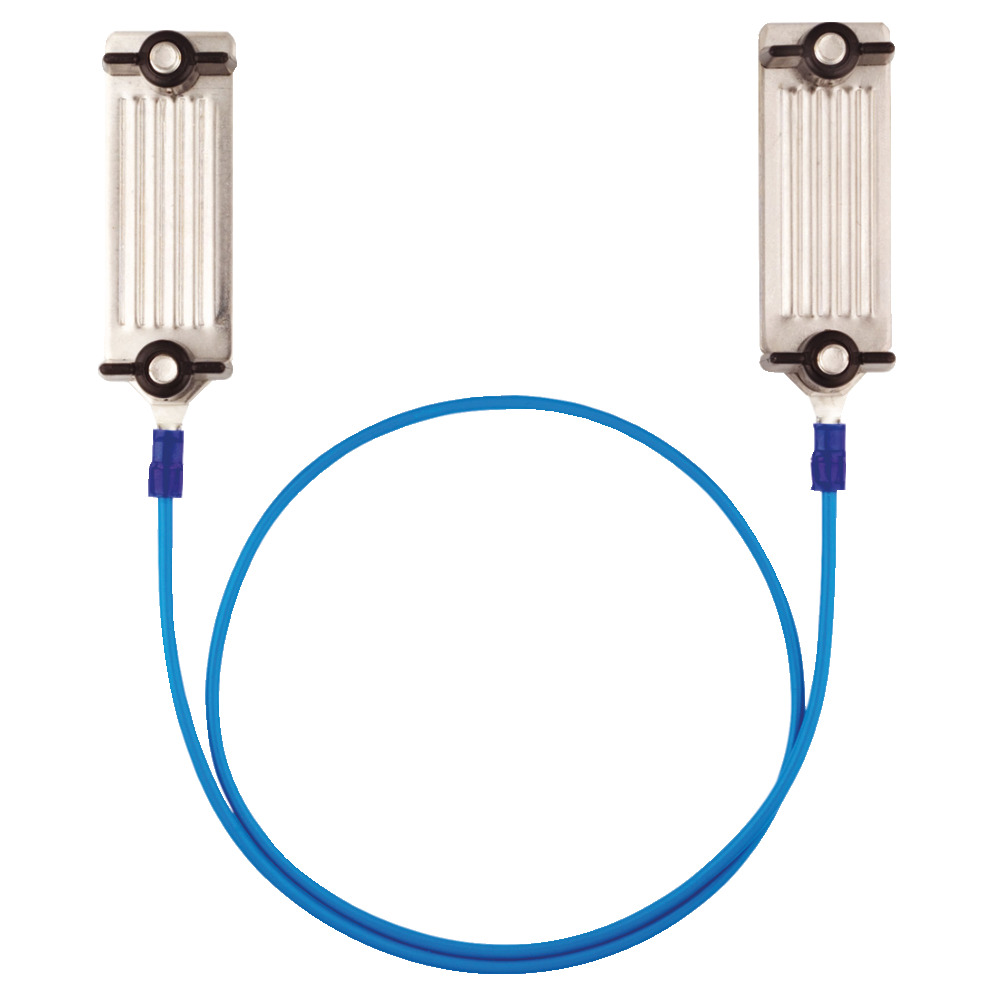 Zaunverbindungskabel mit Edelstahlanschlussplatinen. Die mechanisch und elektrisch perfekte Verbindung zwischen zwei Elektrozaunbändern bis 40 mm Breite. Anschlusskabel ca. 60 cm lang. 1 Stück/Beutel.