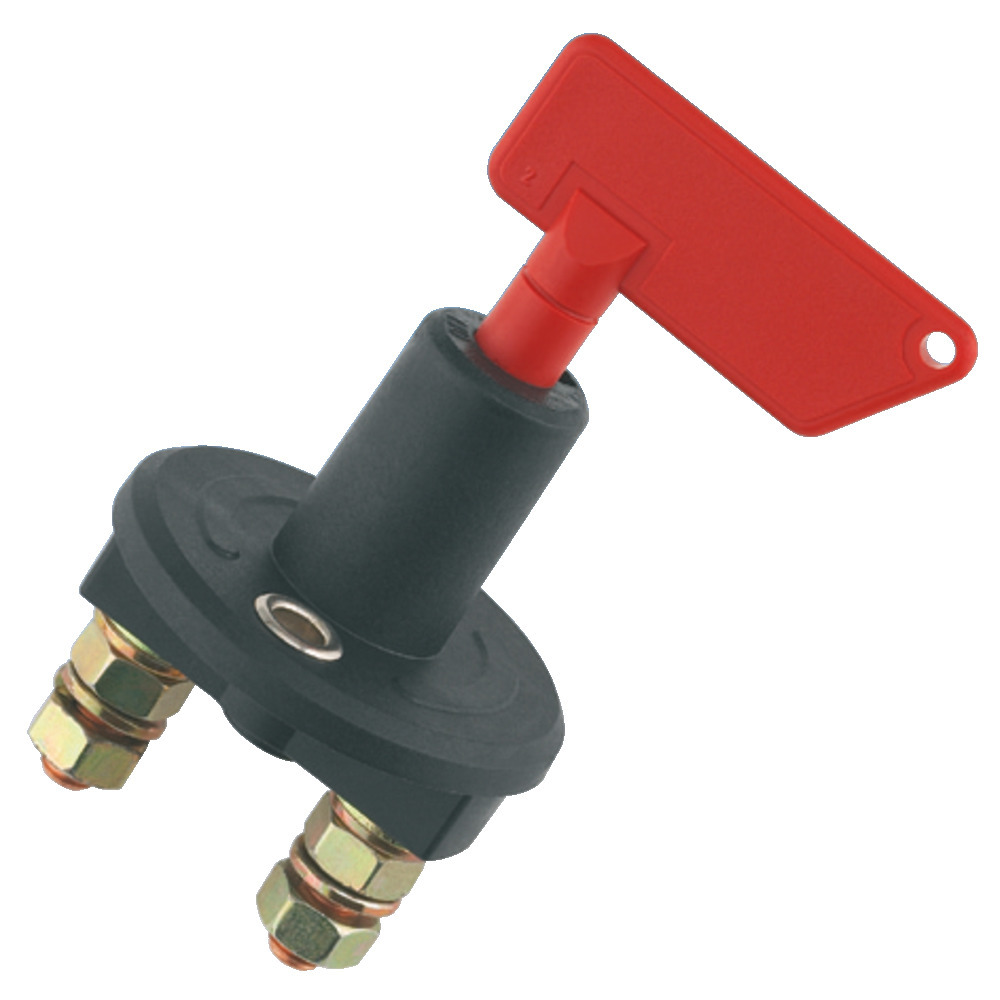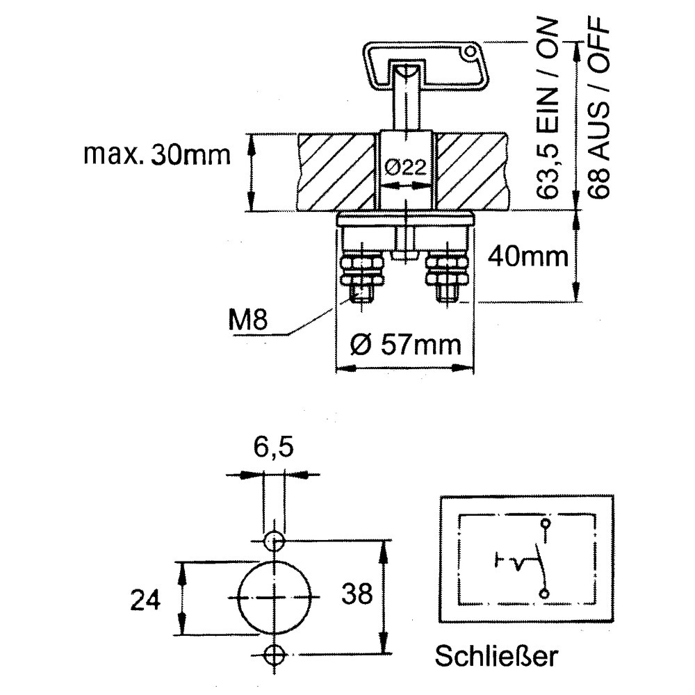 12 V/100 A, Handschalter zum Schalten für + oder - Leitungen. Schaltschlüssel in ″Aus″-Stellung abziehbar, 2 Anschlussschrauben für 8 mm Kabelschuh, Schaltstrom 12/24 V = 100 A, Schaltstrom Kurzzeitbetrieb (5 Sek.) 500 A.