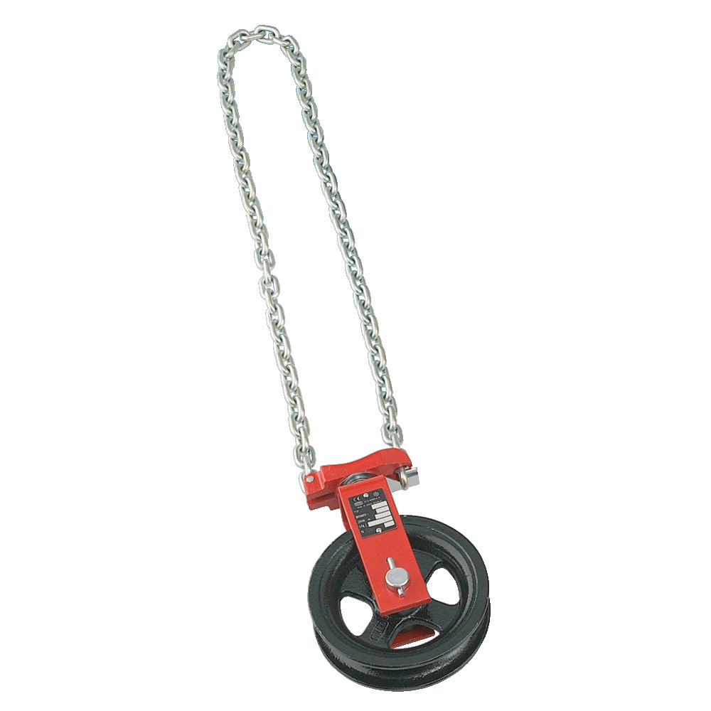 Praktische Umlenkrolle mit 500 kg Tragkraft. Drehbar mit Befestigungskette 1,2 Meter, bis 22 mm Seildurchmesser.