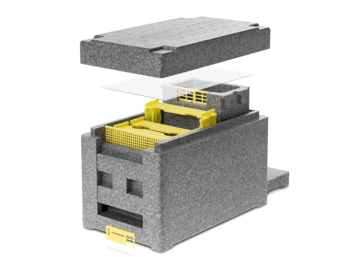 Begattungskästchen aus Hartschaum mit drei Kunststoffrähmchen, zwei Seitenteilen und einen Oberträger. Es gibt einen extra Raum für den Futterteig, den man mit einem Absperrgitter abtrennen kann. Ideal für Belegstellen