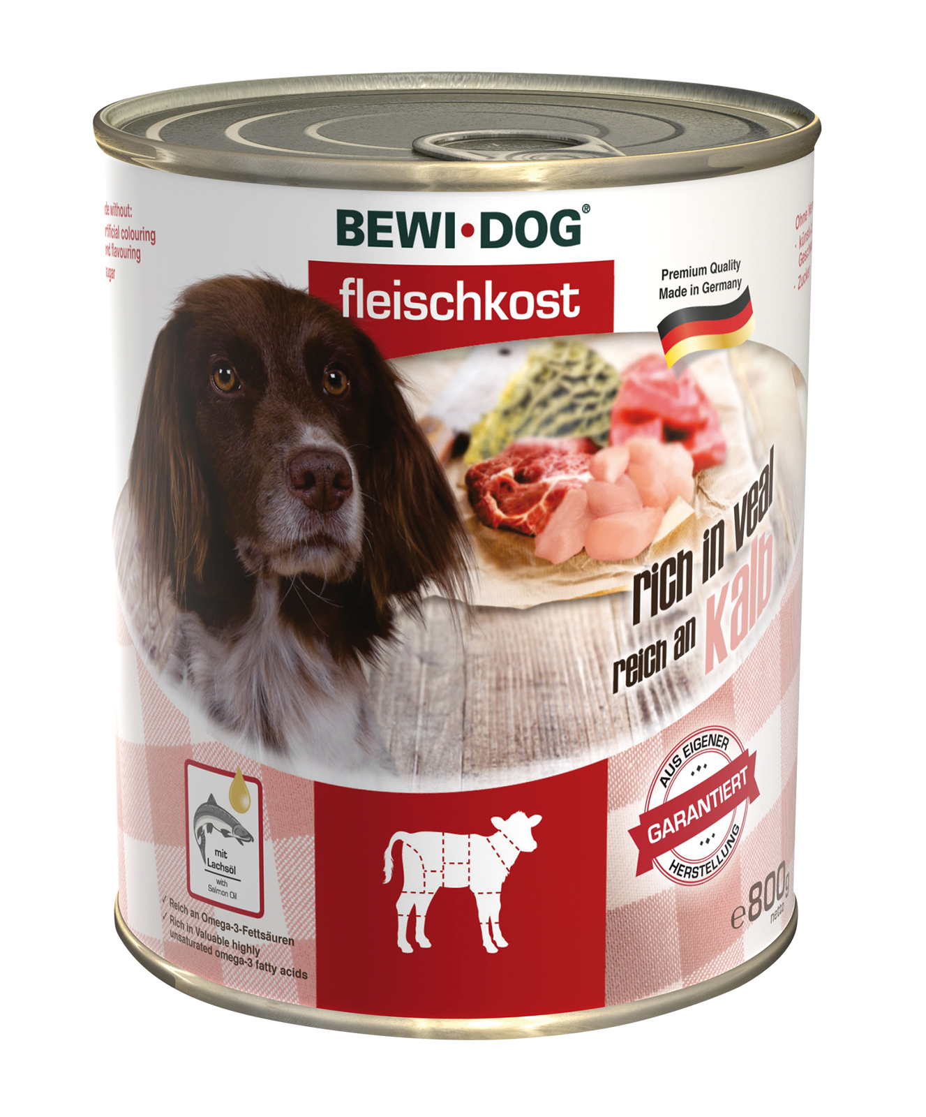 BEWI DOG® Nassfutter Fleischkost enthält saftiges Muskelfleisch mit einer festen Fleischstruktur. So, wie es Hunde lieben. Die vielen Geschmacksvarianten sorgen für eine willkommene Abwechslung.