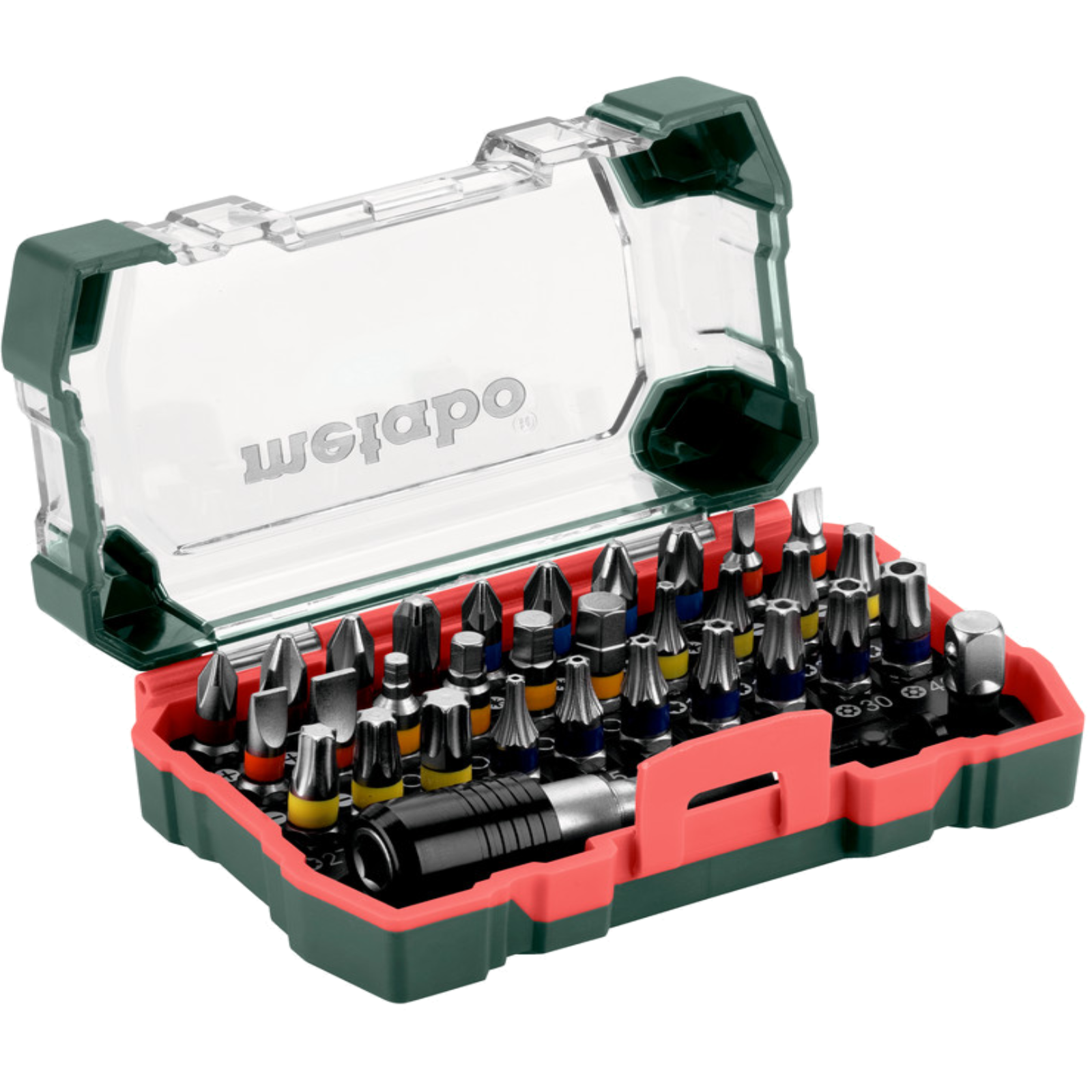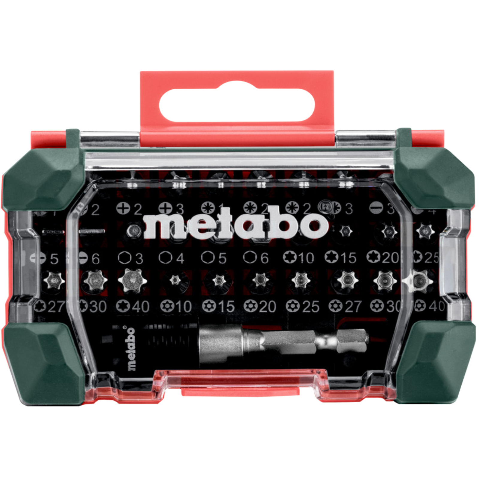 Hochwertiges Bits aus CV-Stahl, mit Farbcodierung für einfaches Finden. Mit magnetischen Schnellwechseladapter sowie Stecknussadapter 1/4 Zoll Antrieb. Geliefert in praktischer Metabo-Kunststoffbox. Bestückung: PH1, 2, 3, PZ 1, 2, 3, SL 3, 4, 5, 6, H 3, 4, 5, 6, Torx: T10, 15, 20, 25, 27, 30 und T40 sowie Torx mit Loch: 10, 15, 20, 25, 27, 30 und 40.