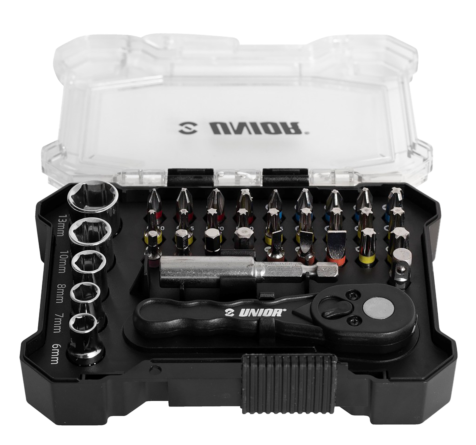 Praktische Bit-Kassette mit Schlitzbit 0,6x3,5, 06x4,5, 1,2x6,5mm, PH-Bits Gr.1,2 und 3, PZ-Bits Gr. 1,2 und 3, Torx-Bits: TX10/15/20/25/27/30 und 40 sowie Bitadapter, Umschaltratsche und Steckschlüssel 6, 7, 8, 10 und 13mm