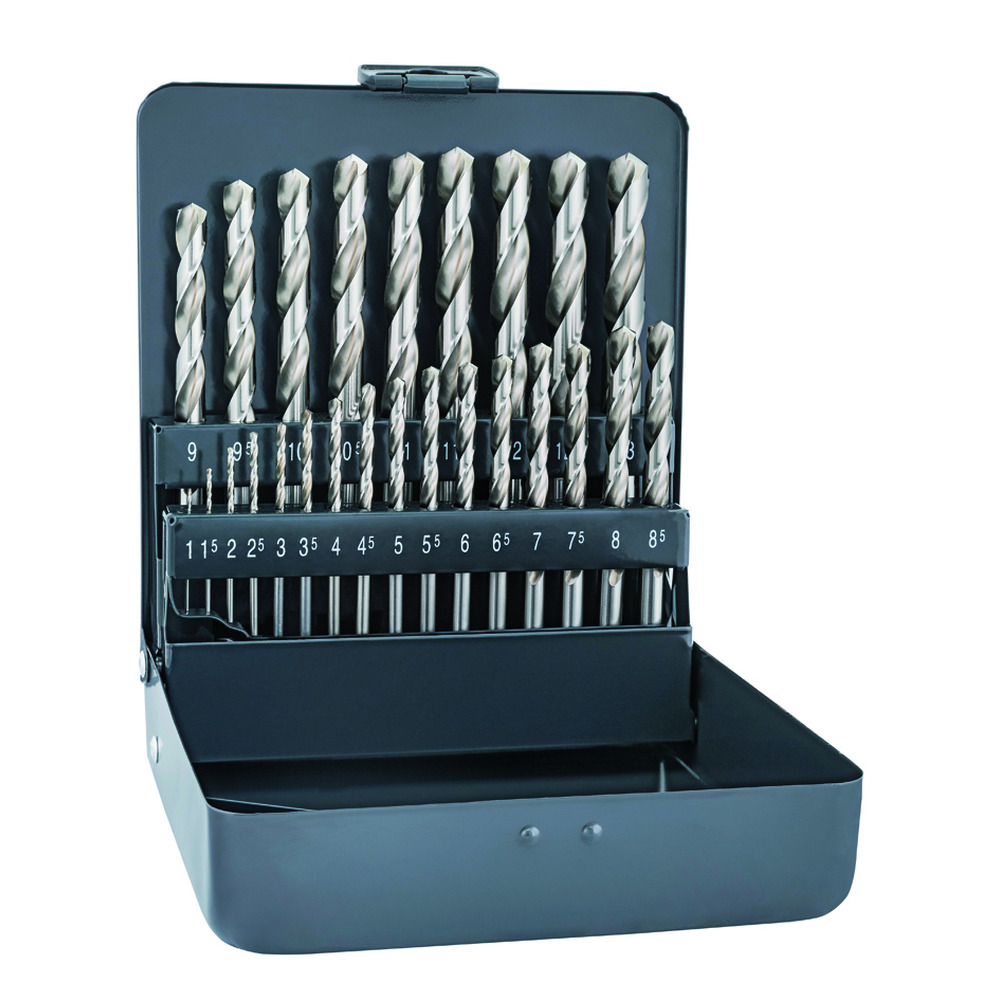 Hochwertige HSS-Cobalt-Bohrer für den Einsatz in hochwertigen Stahl wie z.B. rostfreier Edelstahl. Metallkassette mit Bohrer 1,0-13,0 mm in 0,5 mm Steigung