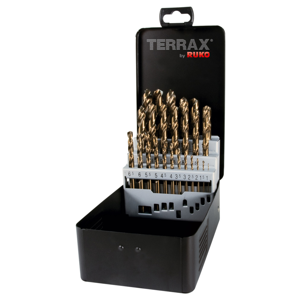 Industrie HSS-Cobalt Sprialbohrer für die Bearbeitung von legiertem und unlegiertem Stahl sowie Rost-und Säurebeständigen Stählen. Steigend in 0,5 mm Schritten von 1,0 bis 13,0 mm. In Metallkassette