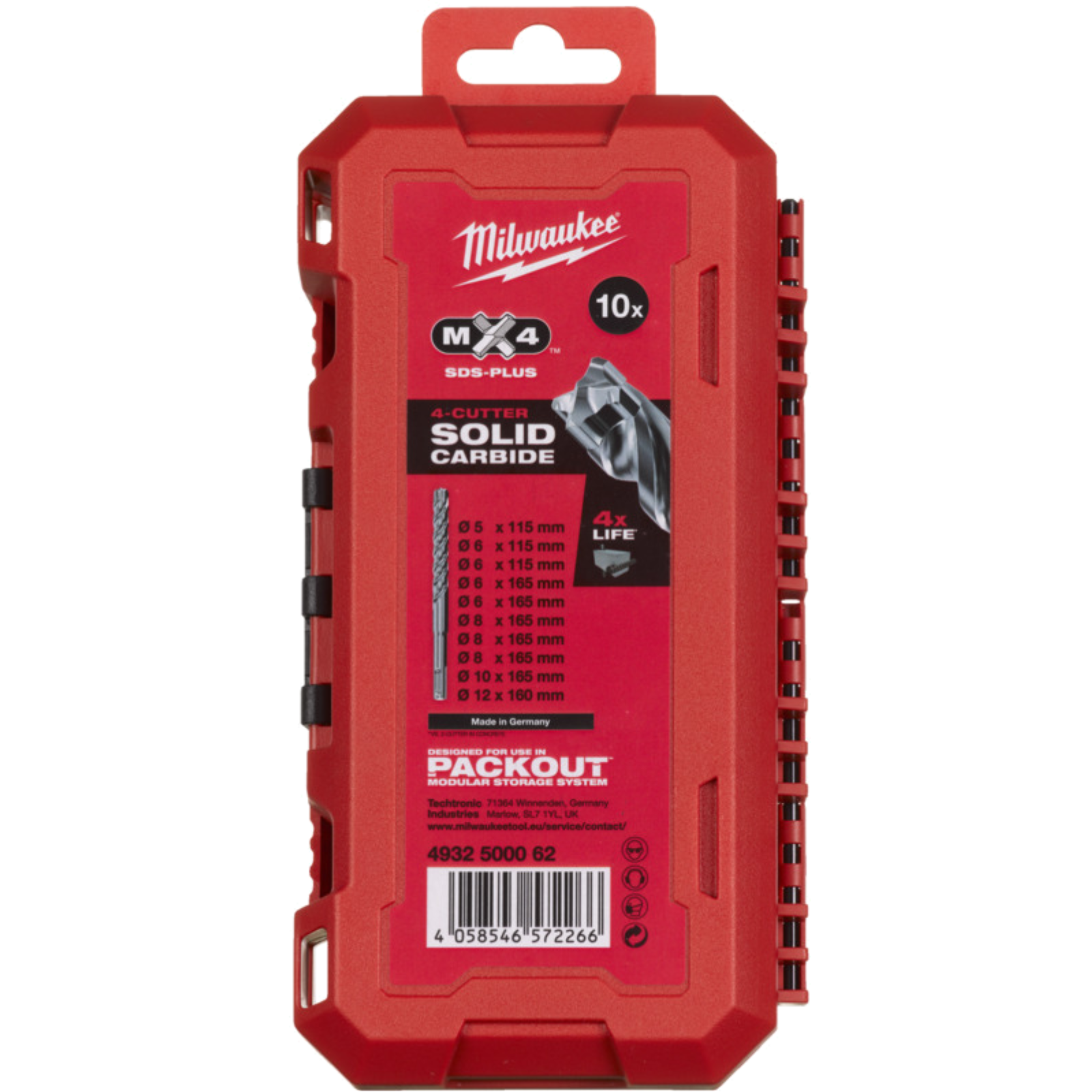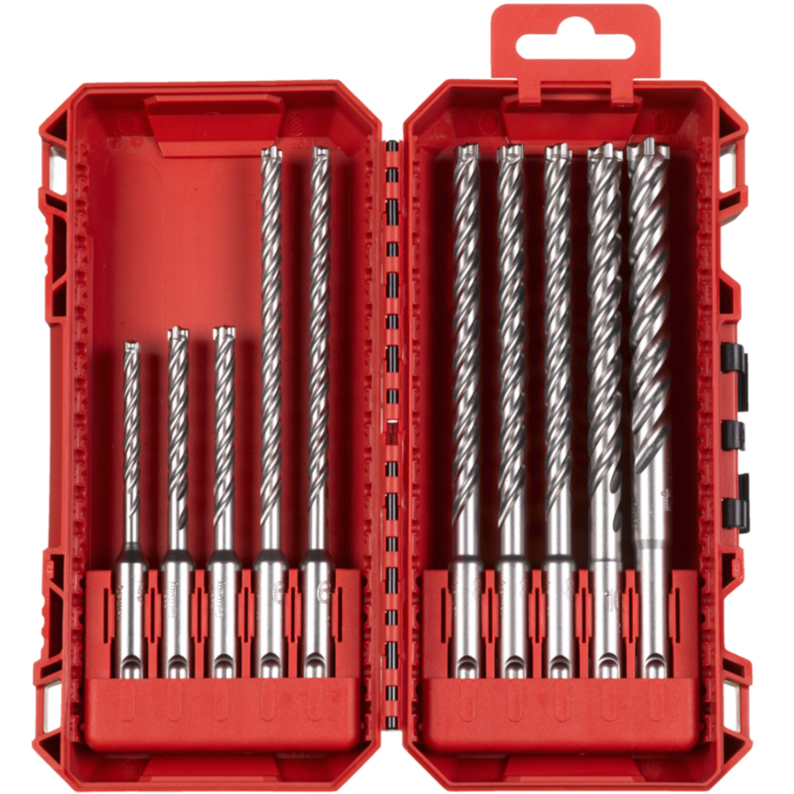 Profi - SDS-Plus 4-Schneidbohrer für harten oder armierten Beton. Inhalt: 5/6/6 x 115 mm, 6/6/8/8/8/10/12 x 165 mm in PACKOUT kompatibler Kassette.