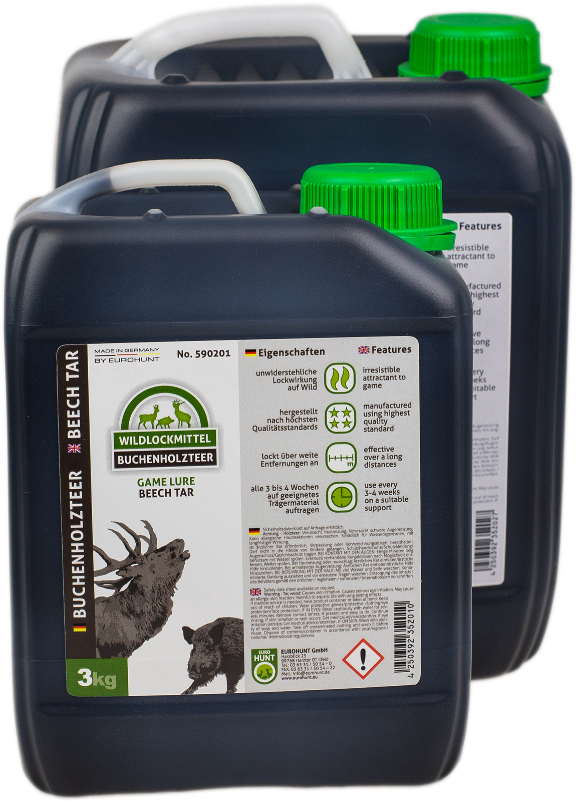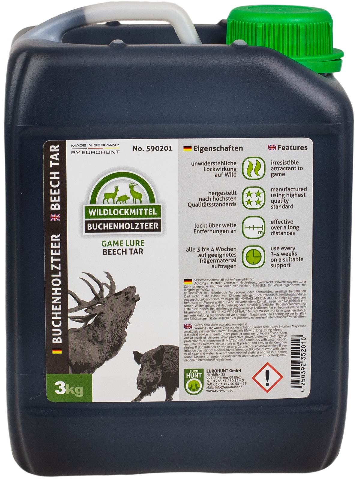 Zieht Schwarzwild und Rotwild über weite Entfernungen an, durch die mittelflüssige Konsistenz sehr gut zu verarbeiten, hervorragend für Malbäume und Kirrungen, einzigartige Lockwirkung, die das Wild anzieht, Top Qualität aus 2 mal gesiedetem Buchenholzteer - ohne Zusätze oder Pheromone.