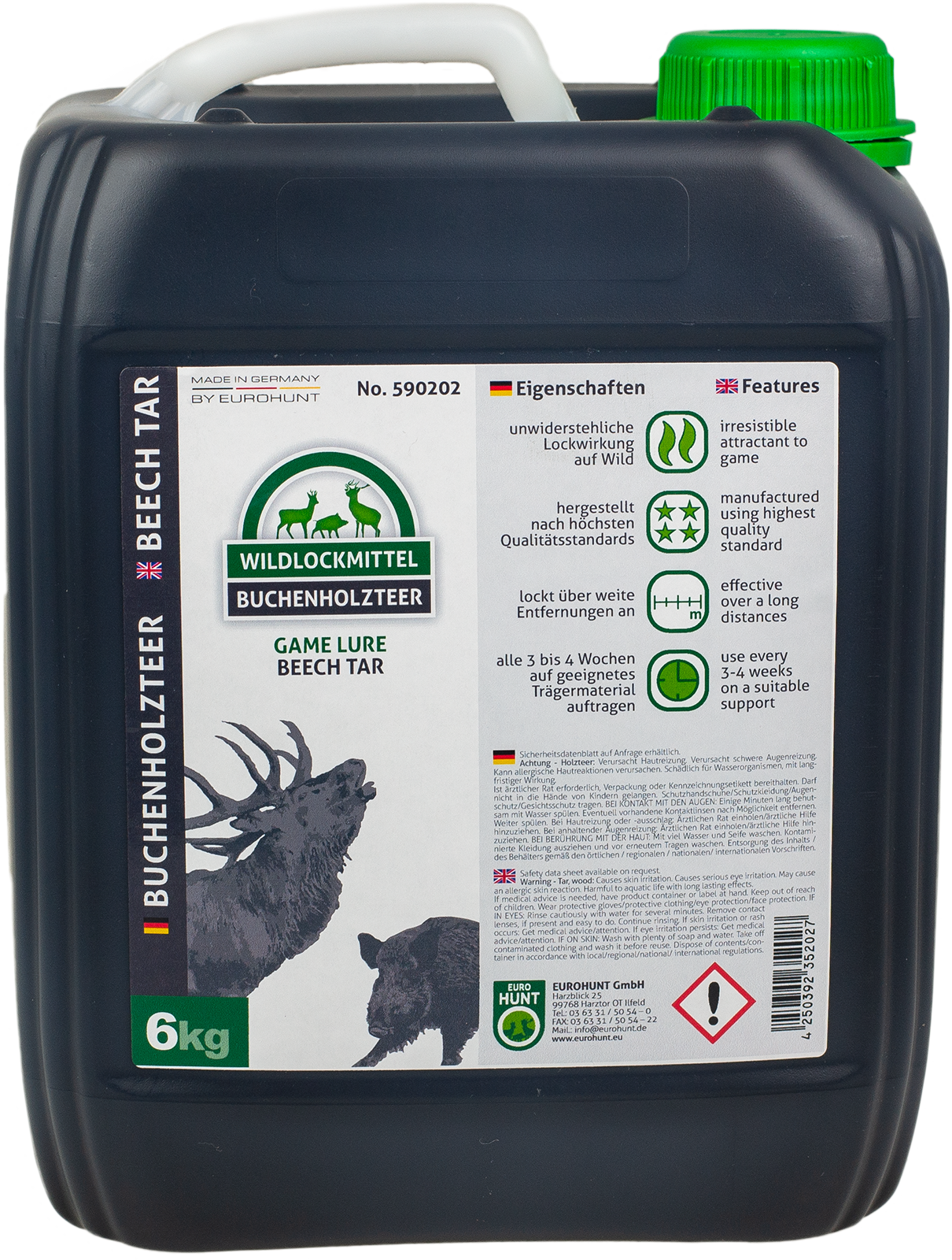 Buchenteer in Reinform!Zieht Schwarzwild und Rotwild über weite Entfernungen an,durch die mittelflüssigeKonsistenz sehr gut zu verarbeiten, hervorragend für Malbäume und Kirrungen,einzigartige Lockwirkung, die das Wild anzieht,Top Qualität aus 2 mal gesiedetem Buchenholzteer - ohne Zusätze oder Pheromone.