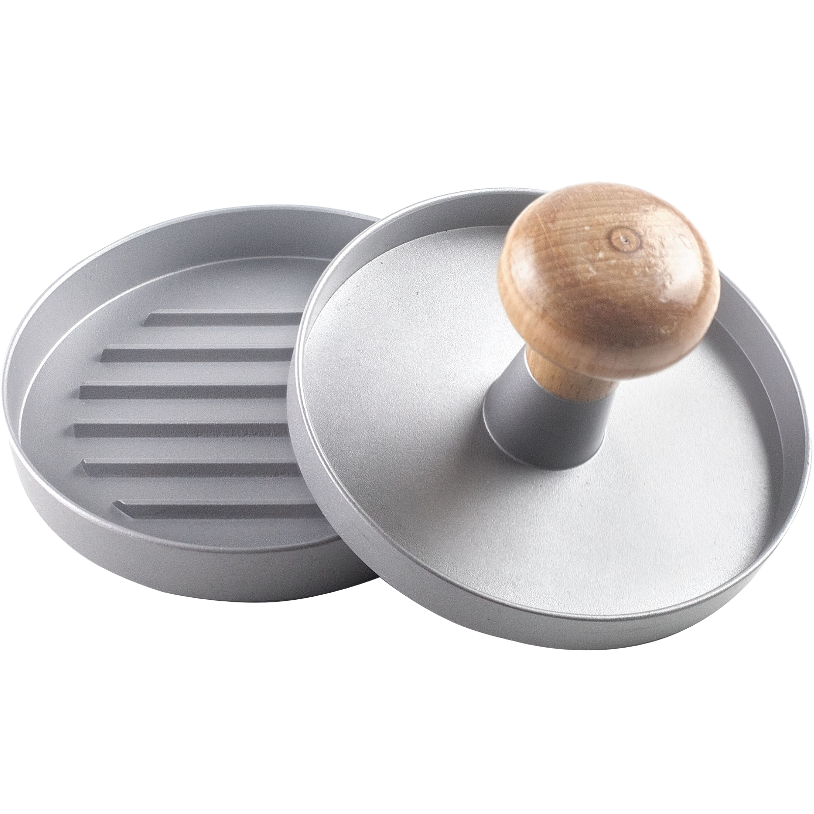 Ideal zur Herstellung von Burger-Patties. Aus antihaftbeschichtetem Alu-Druckguss. Mit Holzgriff.