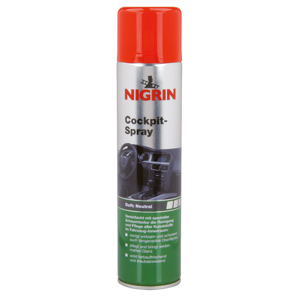NIGRIN Cockpit-Spray erleichtert mit seiner speziellen Schaumtextur die wirksame und schonende Reinigung und Pflege aller Kunststoffe im Fahrzeug-Innenraum. Der Schaum ermöglicht eine einfache, gezielte Anwendung. NIGRIN Cockpit-Spray bildet einen wasserfesten, seidenmatten, schmutzabweisenden und antistatischen Schutzfilm auf dem Kunststoff und vermindert so Ihren Pflegeaufwand.