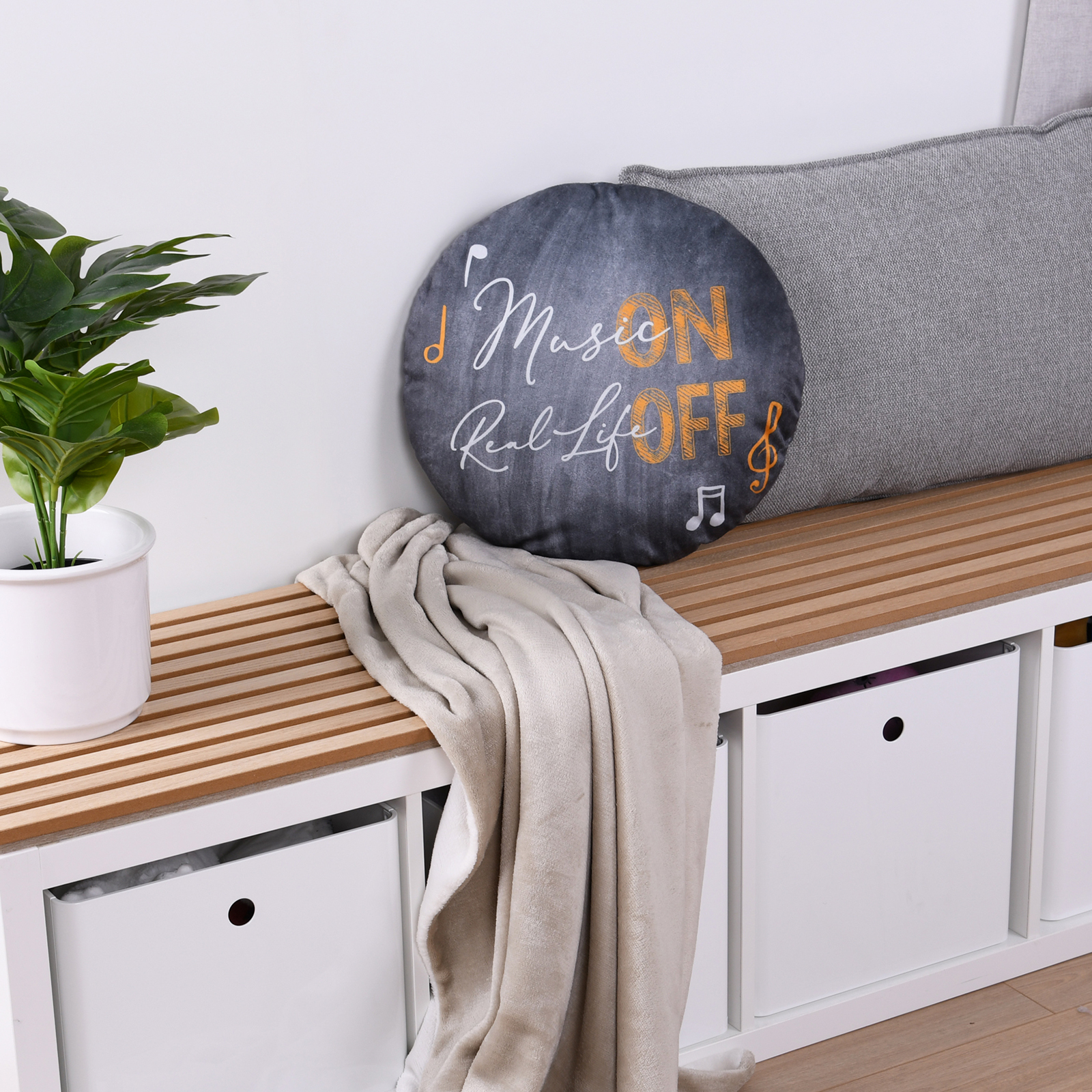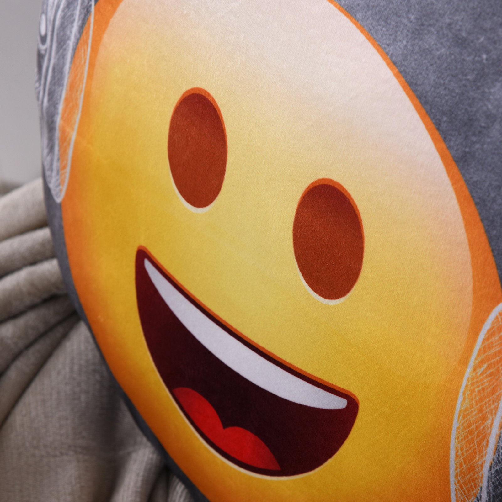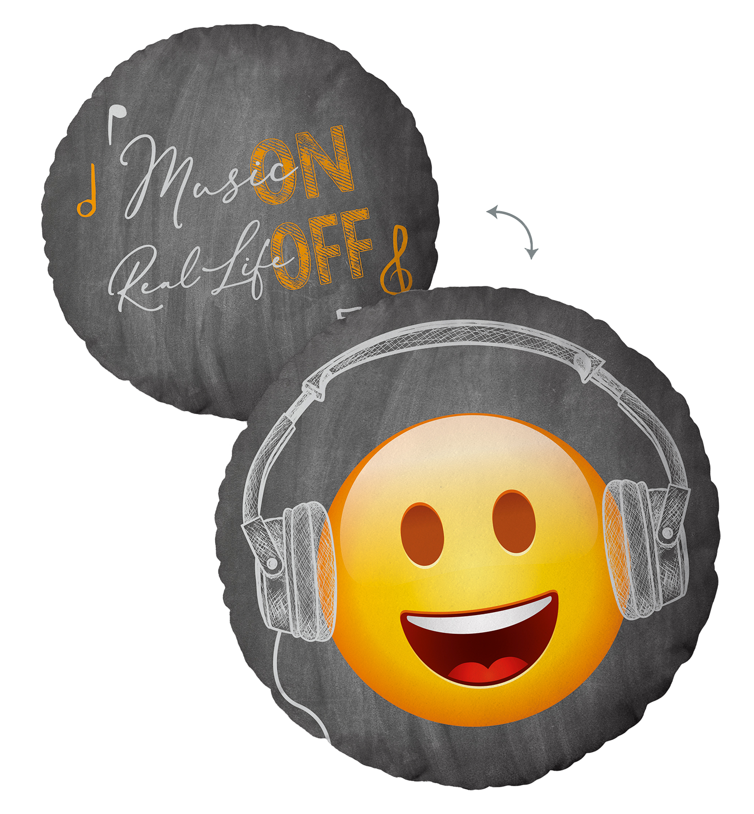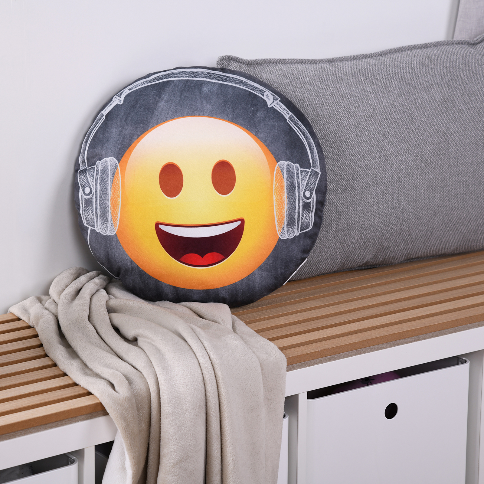 Gute Laune garantiert! Dieses runde Kissen mit witzigem Smiley und Kopfhörern bringt Schwung in dein Zuhause. Das Kissen ist beidseitig nutzbar und überzeugt mit weichem, flauschigem Stoff und kräftigen Farben. Mit der Marke Emotix holst du dir ein Stück Lifestyle nach Hause – inspiriert von den beliebten Emoticons.