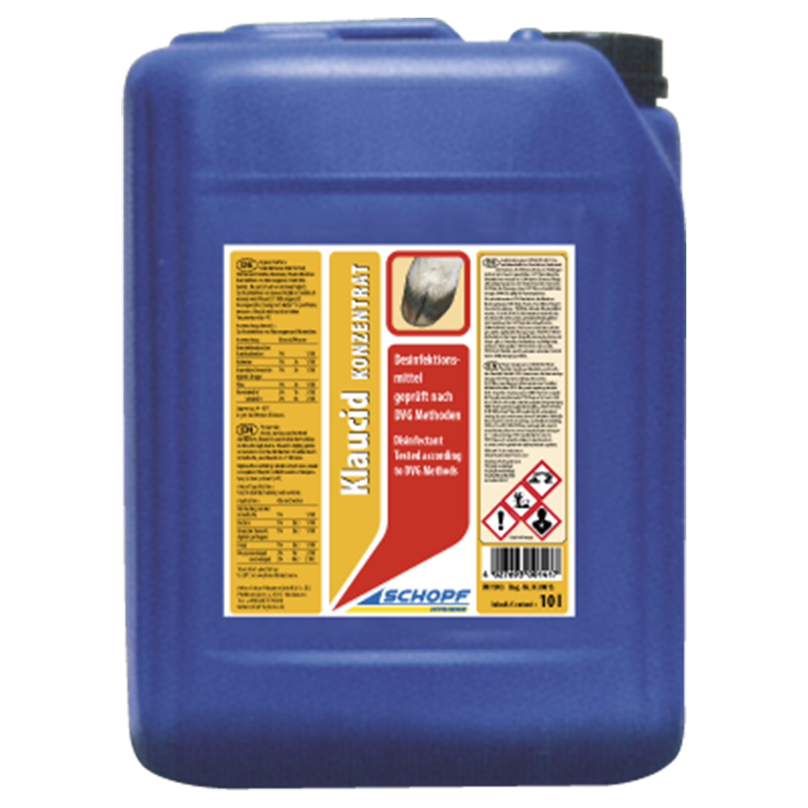 Desinfektionsmittel für Stall, Flächen, Durchlaufwannen und Desinfektionsmatten. Klaucid dient zur Desinfektion von Fahrzeugen im Durchfahrbetrieb. Klaucid ist sehr materialverträglich.Zur Desinfektion von Gummistiefeln in Durchlaufwannen wird Klaucid (1:100) eingesetzt. Die angesetzte Lösung nach Bedarf 1 x pro Woche erneuern. Klaucid wirkt auch bei tiefen Temperaturen bis 4°C.Wirksam gegen die Erreger der Maul- und Klauenseuche!DVG-gelistet