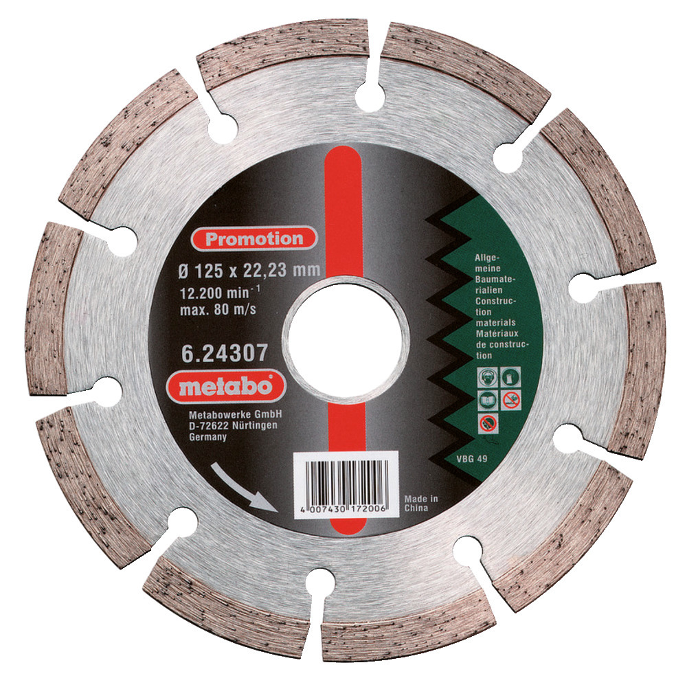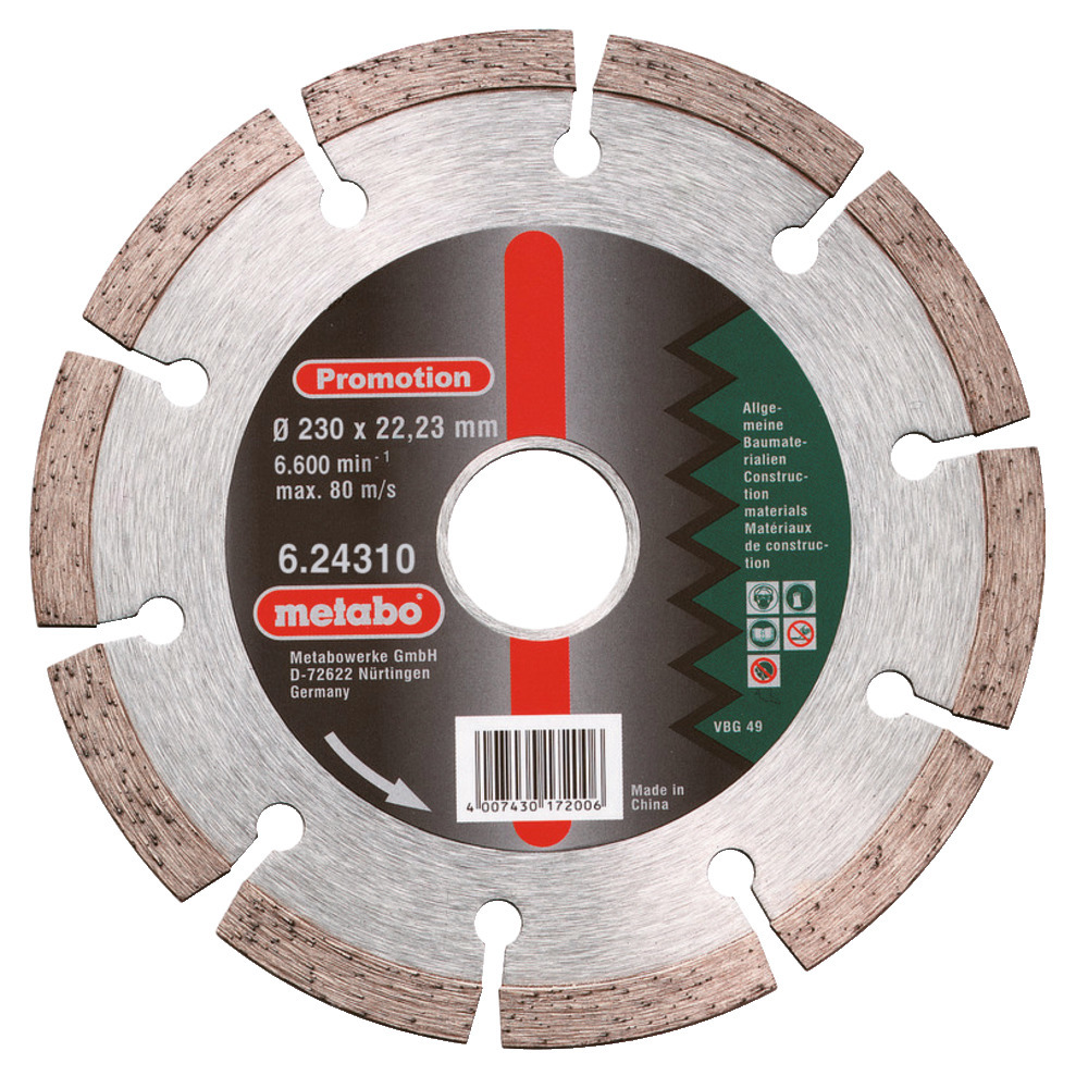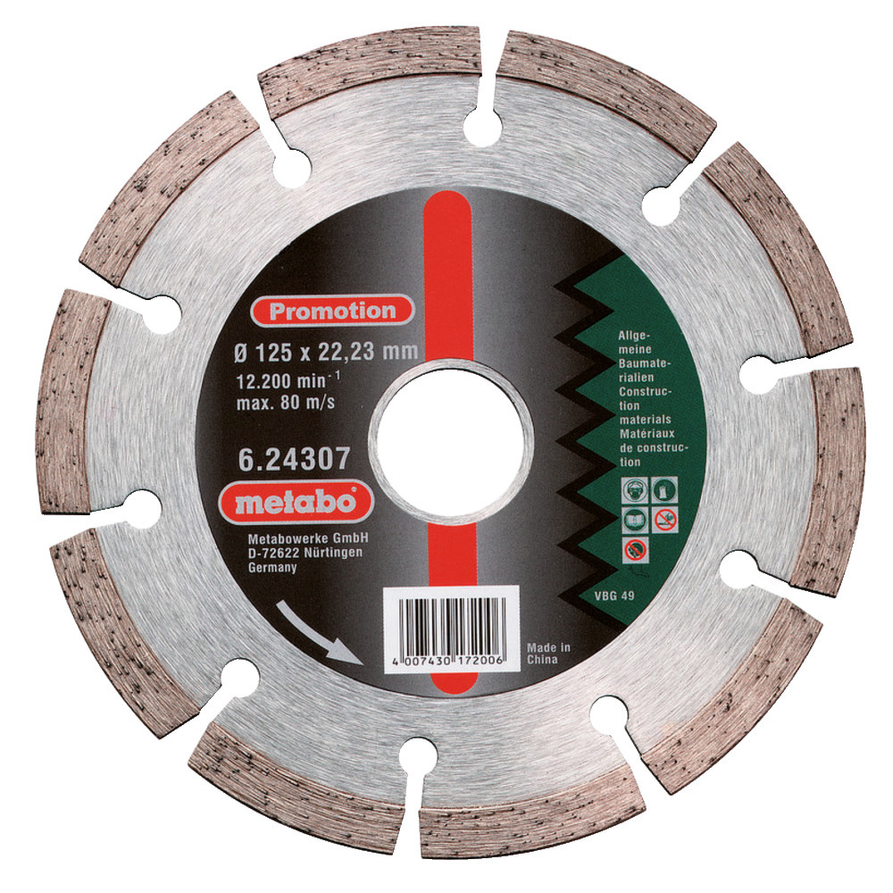 Diamanttrennscheibe für den universellen Einsatz bei allgemeinen Baumaterialien wie Beton, Waschbeton, hartem Sandstein, Tonziegel, etc.Arbeitshöchstgeschwindigkeit 80 Meter pro SekundeAufnahme 22,23 mm