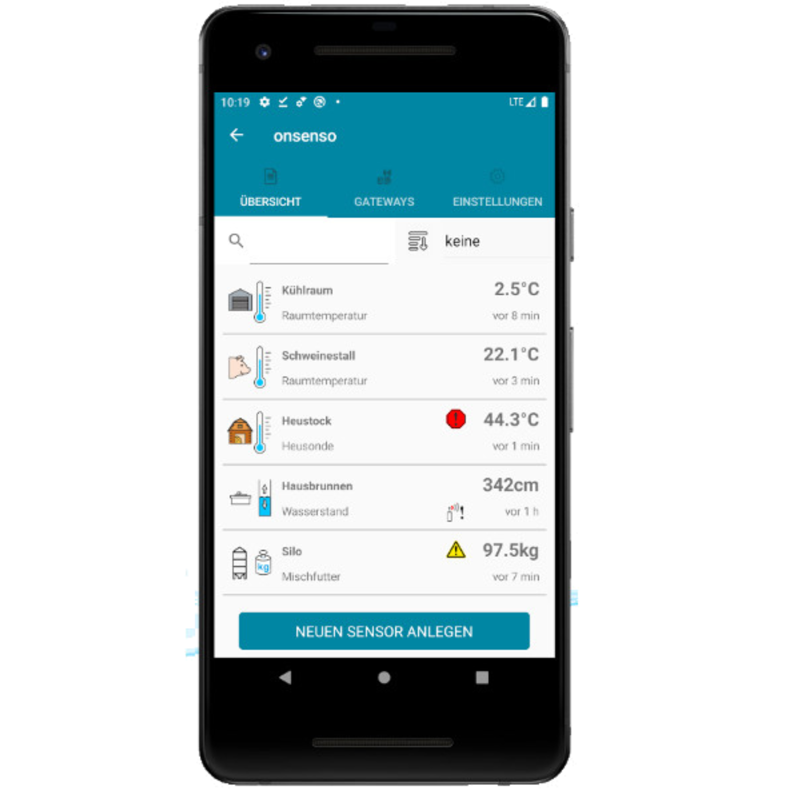 Sicheres Datenmanagement: Die Datenübertragung erfolgt in verschlüsselter Form ausschließlich über Ihren eigenen onsenso Gateway direkt zum onsenso Server. Nur Sie (und von Ihnen ermächtigte Personen) können mit Ihren Zugangsdaten Ihre Messergebnisse sehen und auswerten.Basis für das Onsenso Fernüberwachungssystem. Mit diesem Set haben Sie alle Komponenten für den Einstieg in die Onsenso Fernüberwachung, auch den Gateway und die erste Jahreslizenz. Sie können jederzeit weitere Sensoren oder Messgeräte ergänzen und Ihr System erweitern.