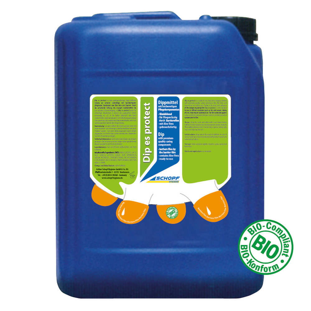 Dip es protect ist ein gebrauchsfertiges Dippmittel auf Milchsäurebasis für eine sichere Euterpflege. Es enthält hochwertige Substanzen wie Aloe Vera und Glycerin. Der Isolationsfilm haftet langfristig und bietet zusätzlichen Schutz, besonders in kalten Jahreszeiten oder beim Trockenstellen. Zusätzlich hält der Barriere-Film Fliegen fern und unterstützt die natürlichen Widerstandskräfte.