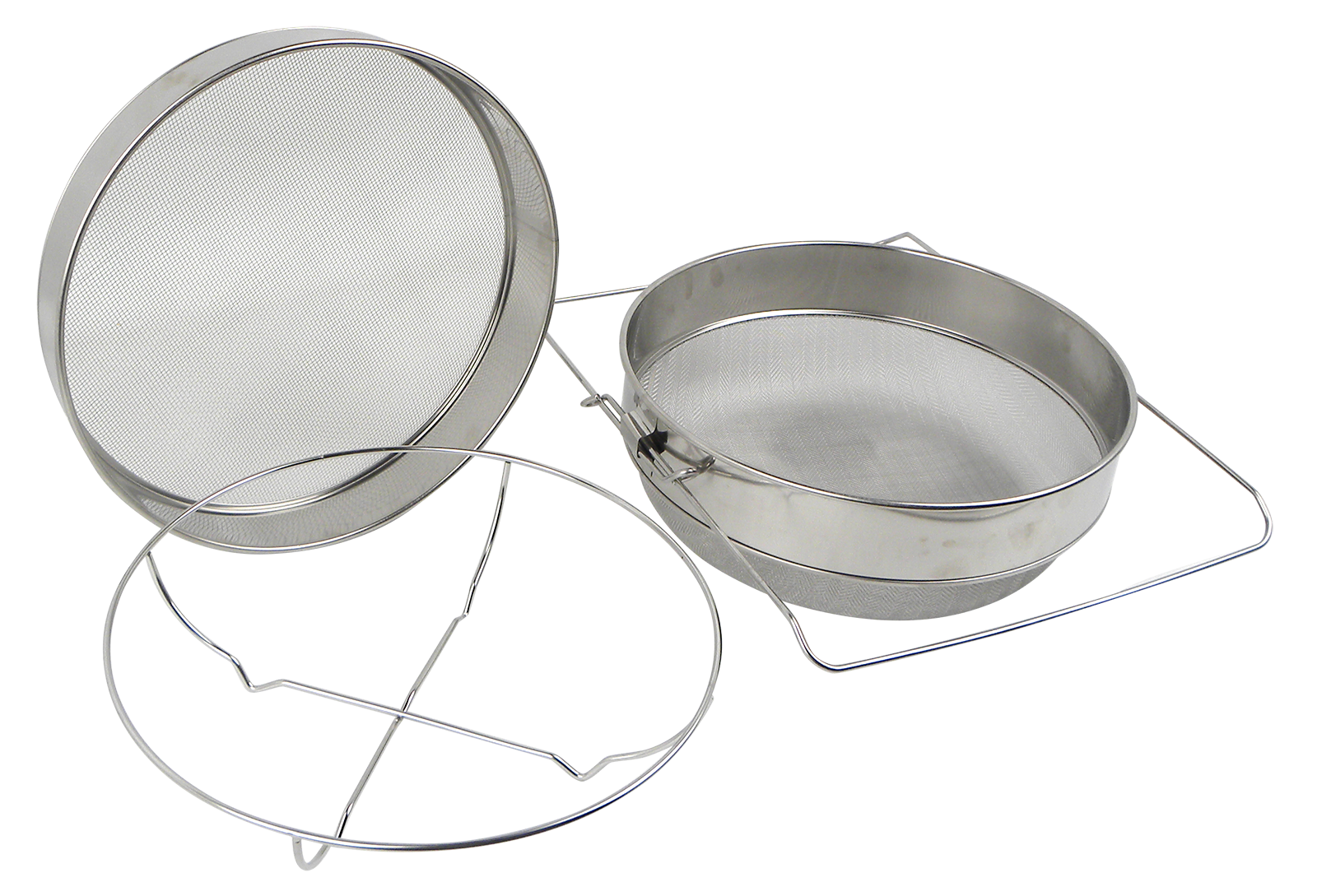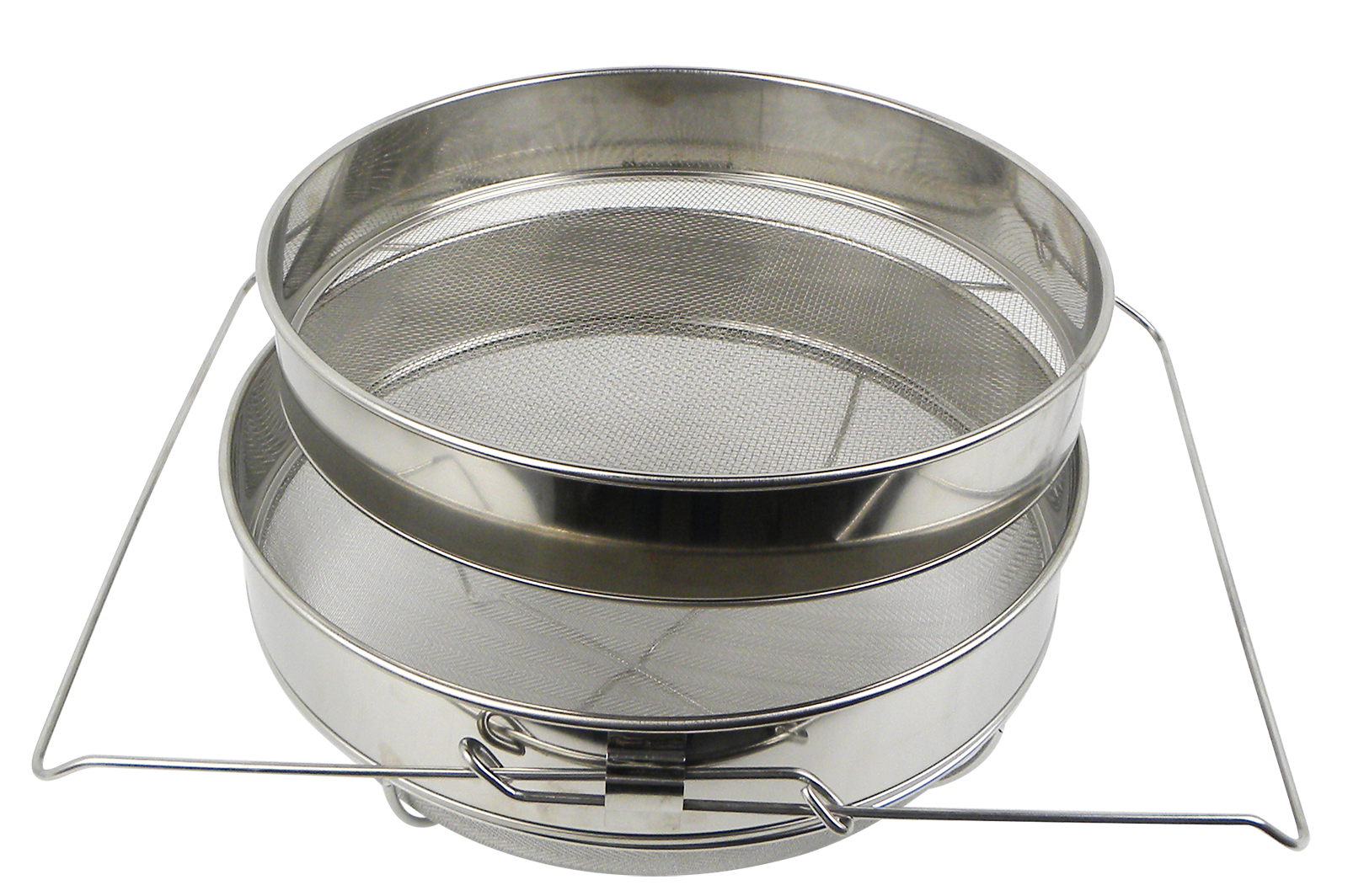 Großes Doppelsieb komplett aus Edelstahl. Durch das bis zu 47cmausziehbare, verstellbare Gestell ist es mit vielen Honigtöpfen kombinierbar.Es besteht aus zwei ineinander gesteckten Sieben, von denen das gröbere eineMaschenweite von 2mm und das feinere eine Maschenweite von 0,4mm besitzt.Somit können sowohl größere als auch kleinere Wachspartikel oder sonstigeVerunreinigungen herausgefiltert werden.