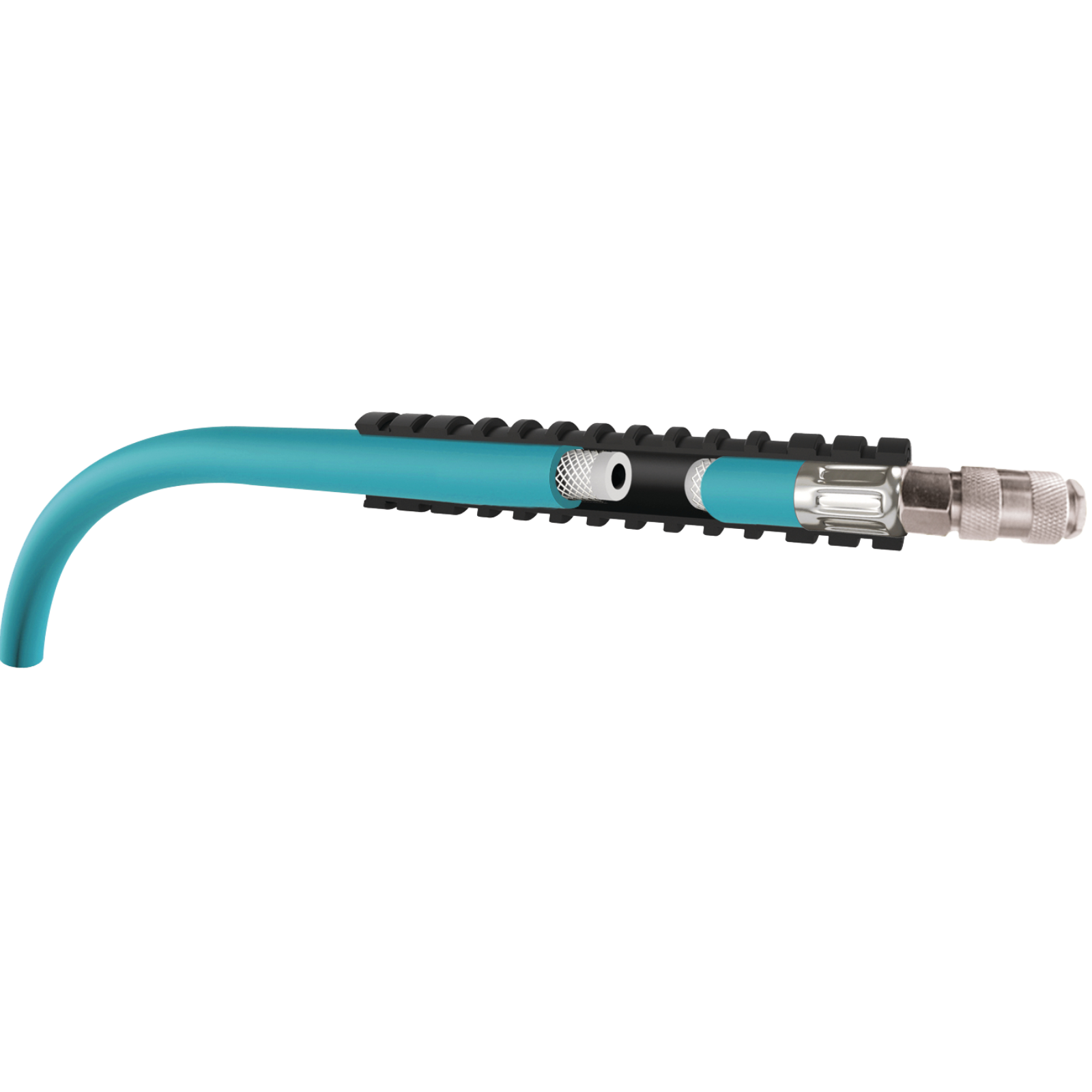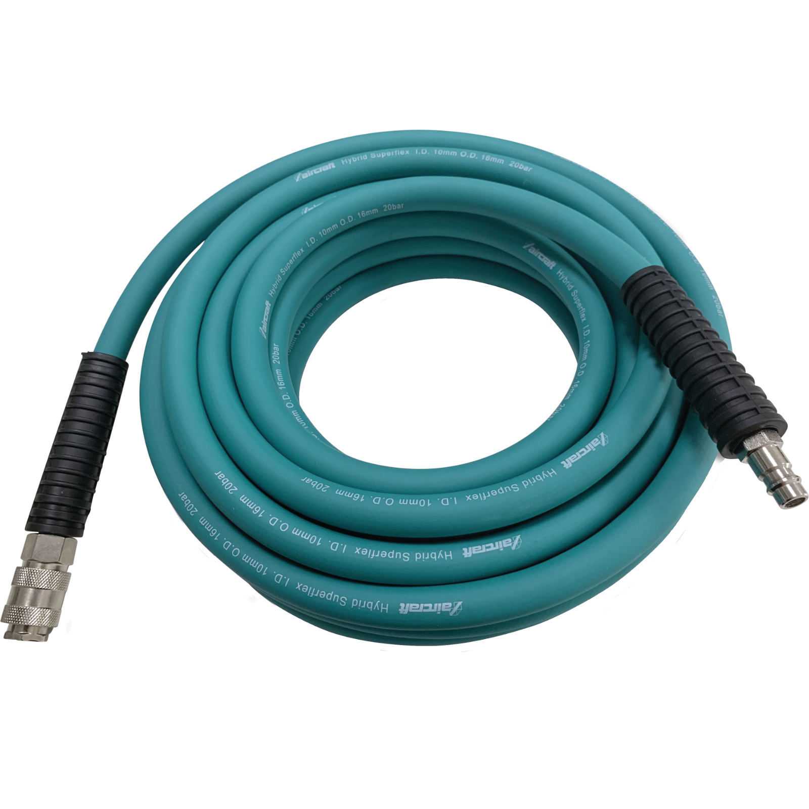 Hybrid Polymer Material mit Gewebeeinlage, auch bei tiefen Temperaturen extrem flexibel, abriebfest und hohe Beständigkeit gegen Umwelteinflüsse, wie z. B. UV Licht, Öl, Ozon. Betriebsdruck bis maximal 20 bar, wesentlich geringeres Gewicht als Gummischläuche. Einsetzbar in Temperaturbereichen zwischen -40 °C und 80 °C. Ausgestattet mit Knickschutz an beiden Enden und je einer Schnellkupplung und Stecktülle.