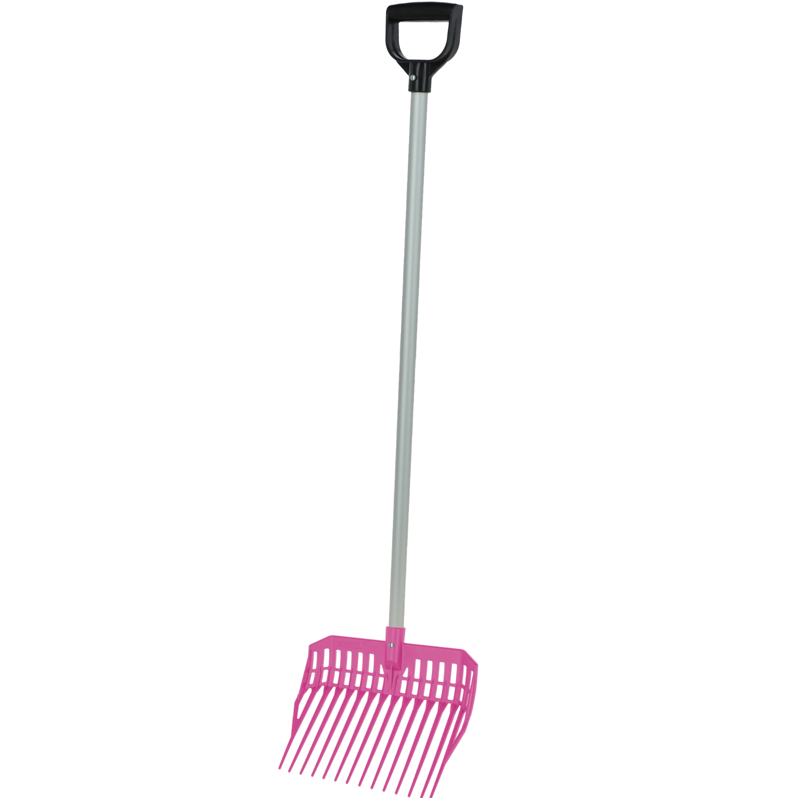 Pinke Kinder-Dunggabel aus Kunststoff mit leichtem Alu-Stiel.
