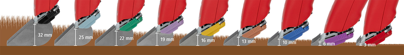 Tipp: Addiere die Schnittlänge des Scherkopfes mit der Schurhöhe des Edelstahl-Aufsteckkamms, z. B. GT330 1,5 mm + GTA133 braun = Schnittlänge 14,5 mm