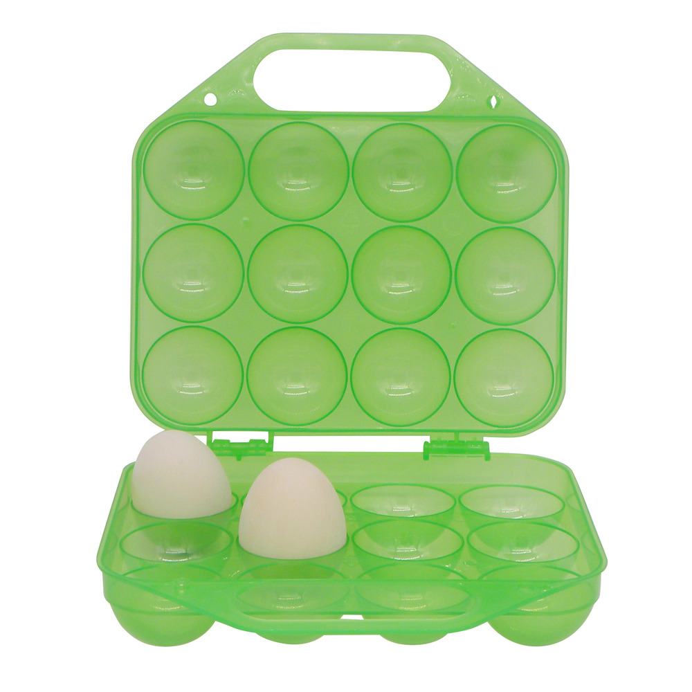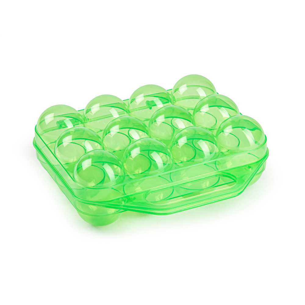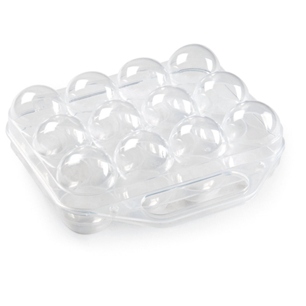 Wiederverwendbare, kompakte und stabile 12er Mehrweg-Eierschachtel aus Kunststoff (PP). Mit Scharnier, Klickverschluss und Tragegriff für einfachen Transport. Lebensmittelecht und spülmaschinenfest. Geeignet für Eier der Gewichtsklassen S - L. 200x190x75 mm.