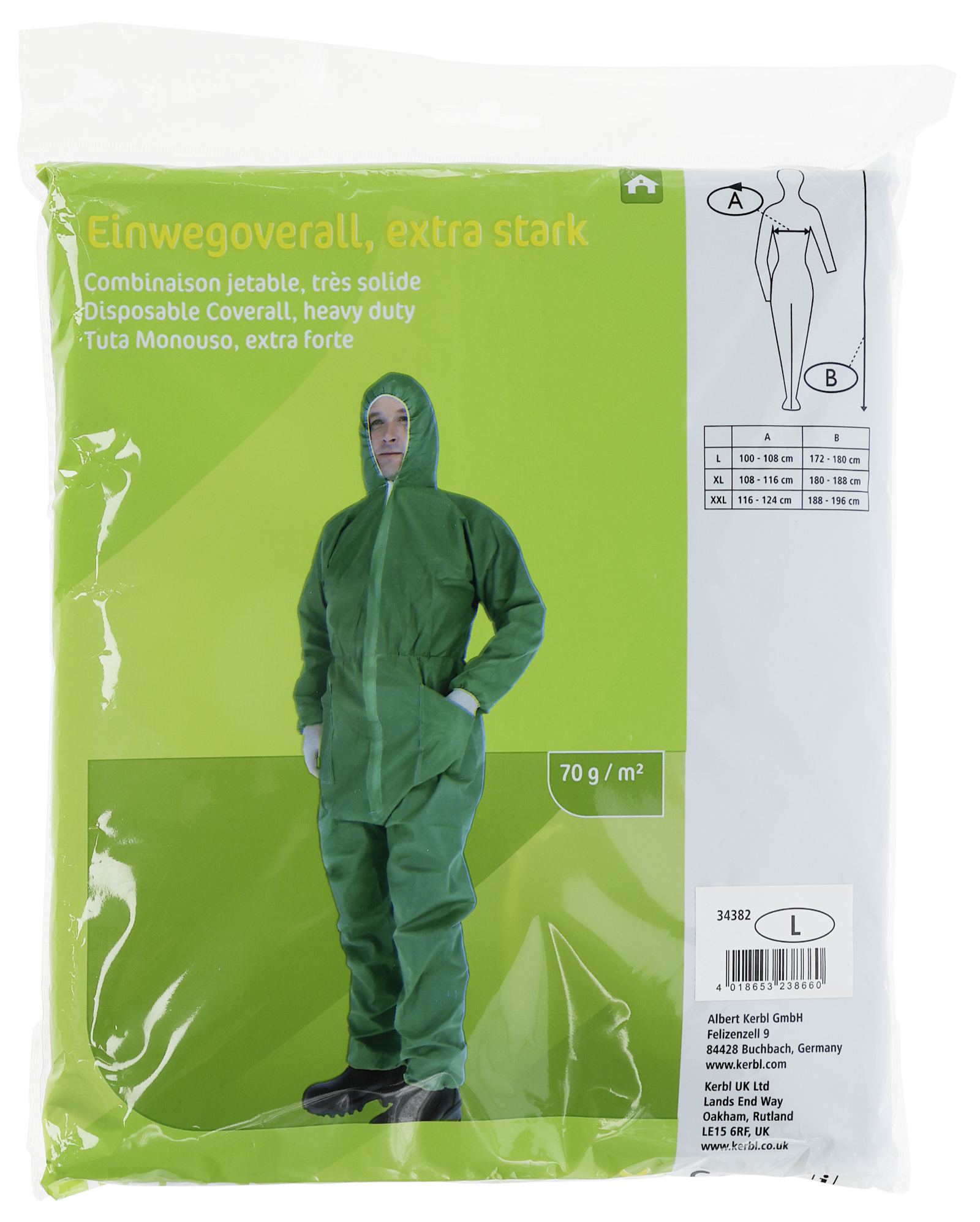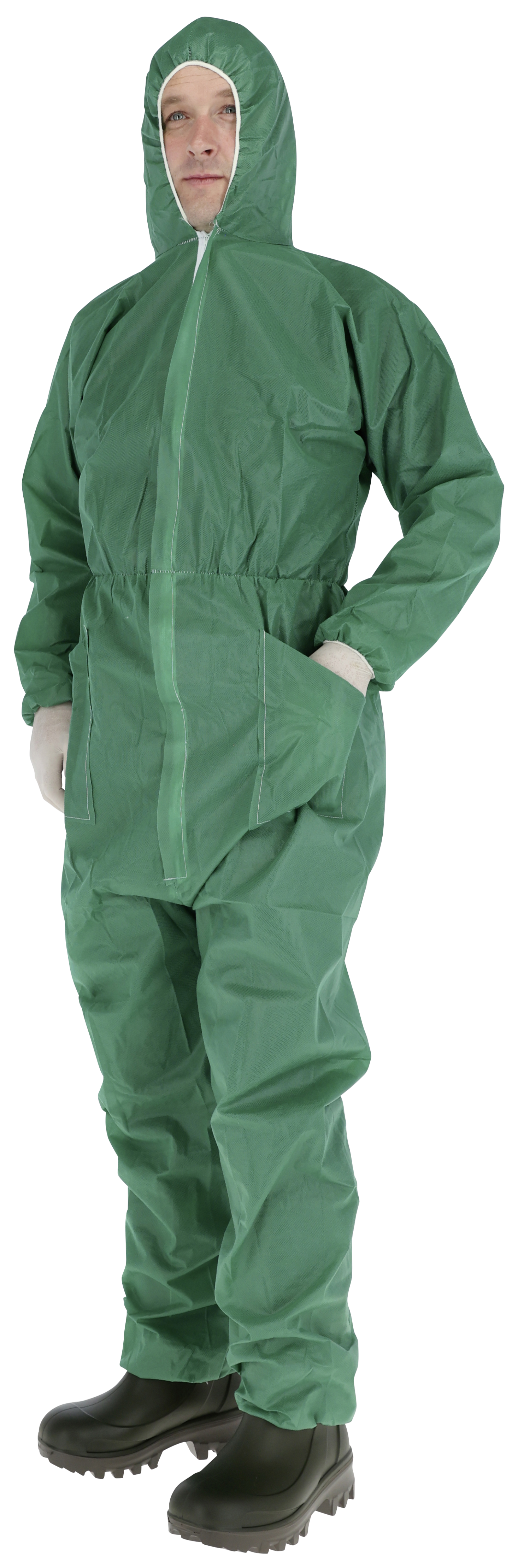 Grüner Einmaloverall. Flächengewicht 70 g/m²