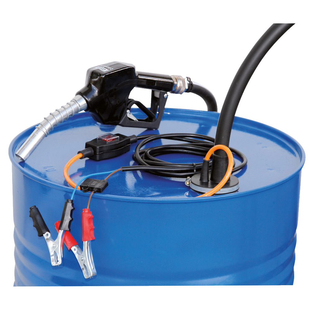 Komplett Set mit Pumpe, 4 m Schlauch, 4 m Kabel mit Schalter und Polzangen sowie Automatik-Zapfpistole für Diesel.