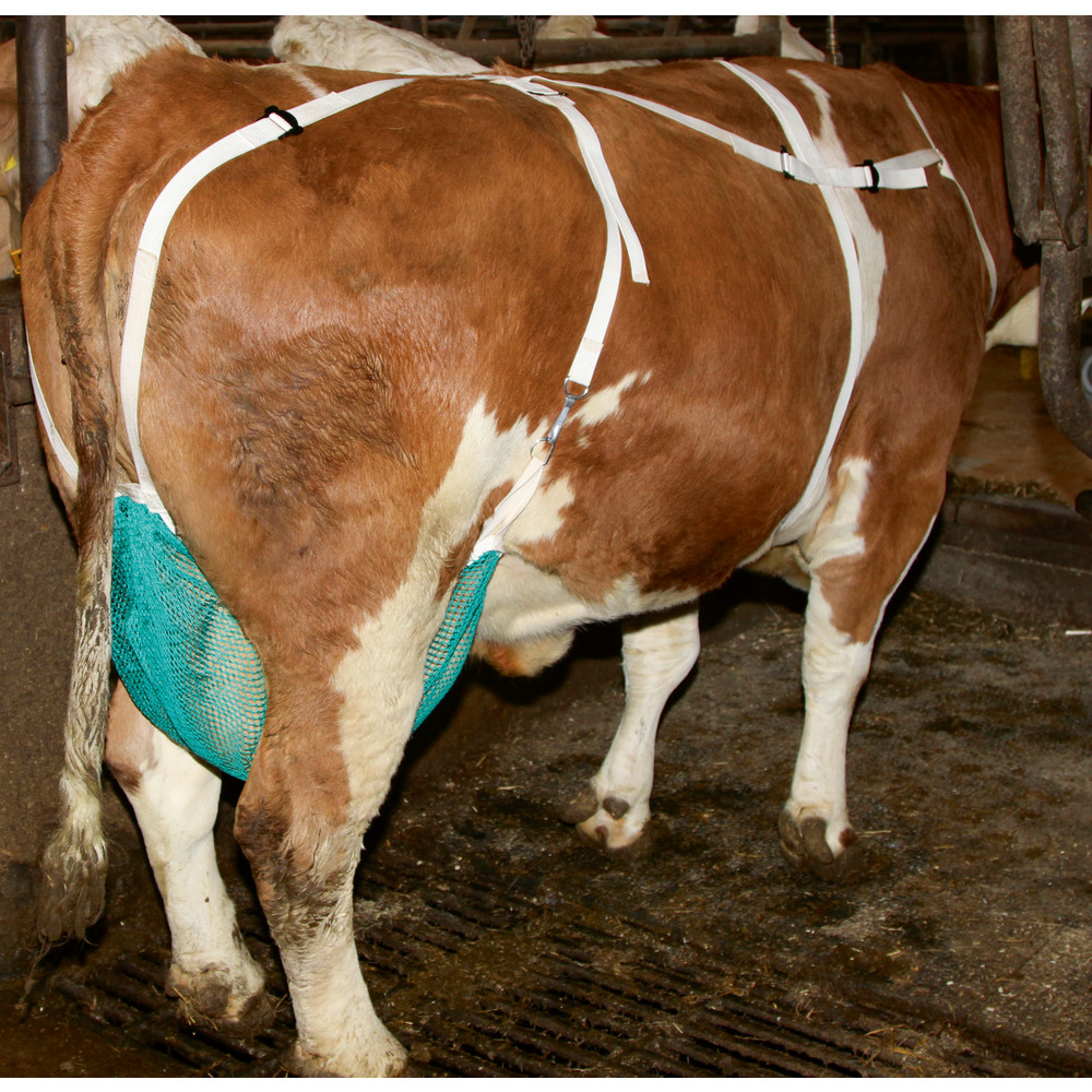 Die Brust- und Nackenbegurtung gibt diesem Zitzenschutz / Euternetz zusätzlichen Sitz und Halt an der Kuh, Zitzenschutz begrenzt Zitzenverletzungen, die in einem zu engen Stall oder auf der Weide schnell passieren können, ideal auch zur Verhinderung von Trittverletzungen.