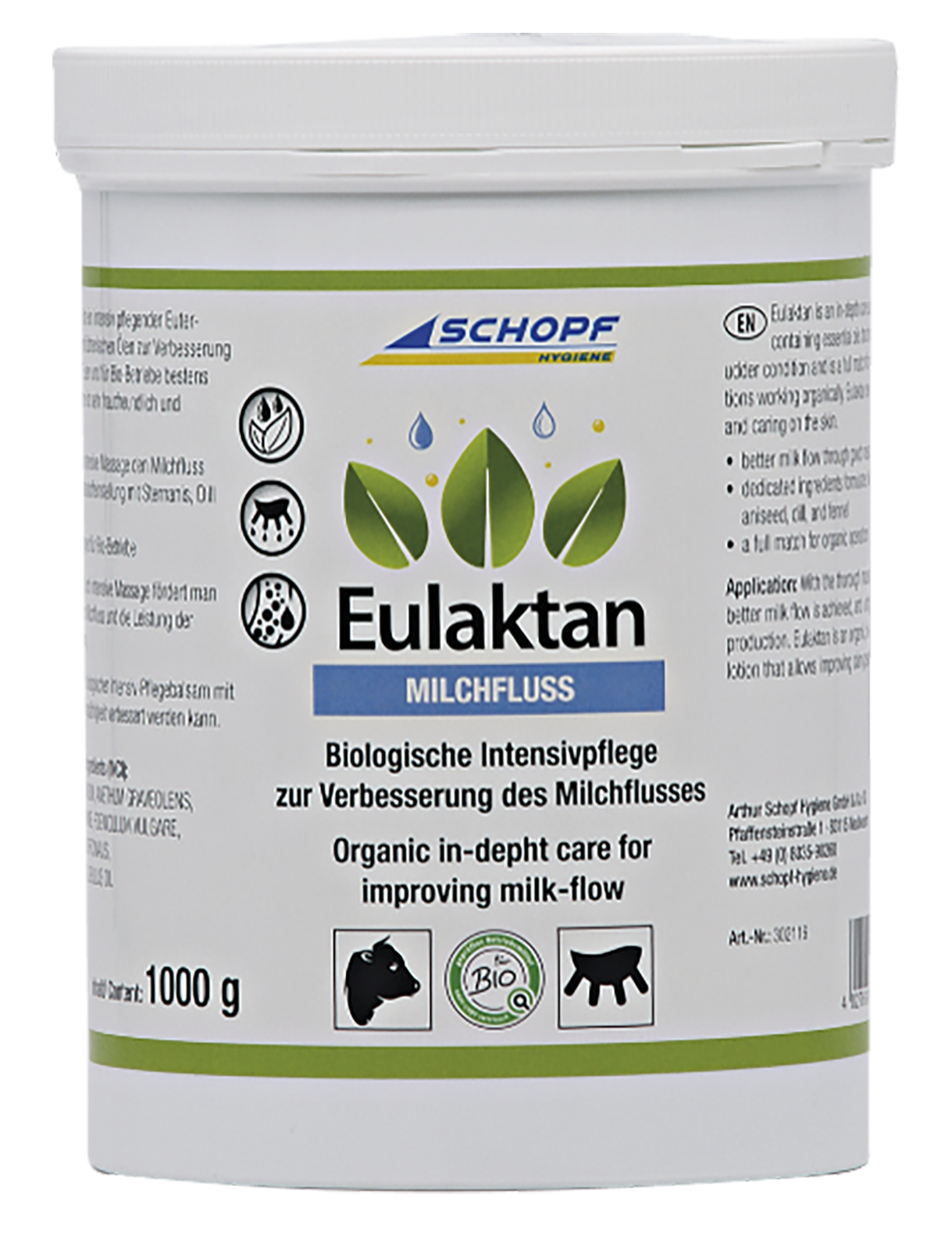 Eulaktan ist ein intensiv pflegender Euterbalsam, der ätherische Öle enthält und speziell für Bio-Betriebe geeignet ist. Durch intensive Massage kann man den Milchfluss fördern und die Leistung der Tiere steigern. Eulaktan ist sehr hautfreundlich und wirkt gegen Risse und Trockenheit. Zusätzlich ist es fliegenabweisend, verbessert die Qualität der Euter und unterstützt die Euterhygiene.