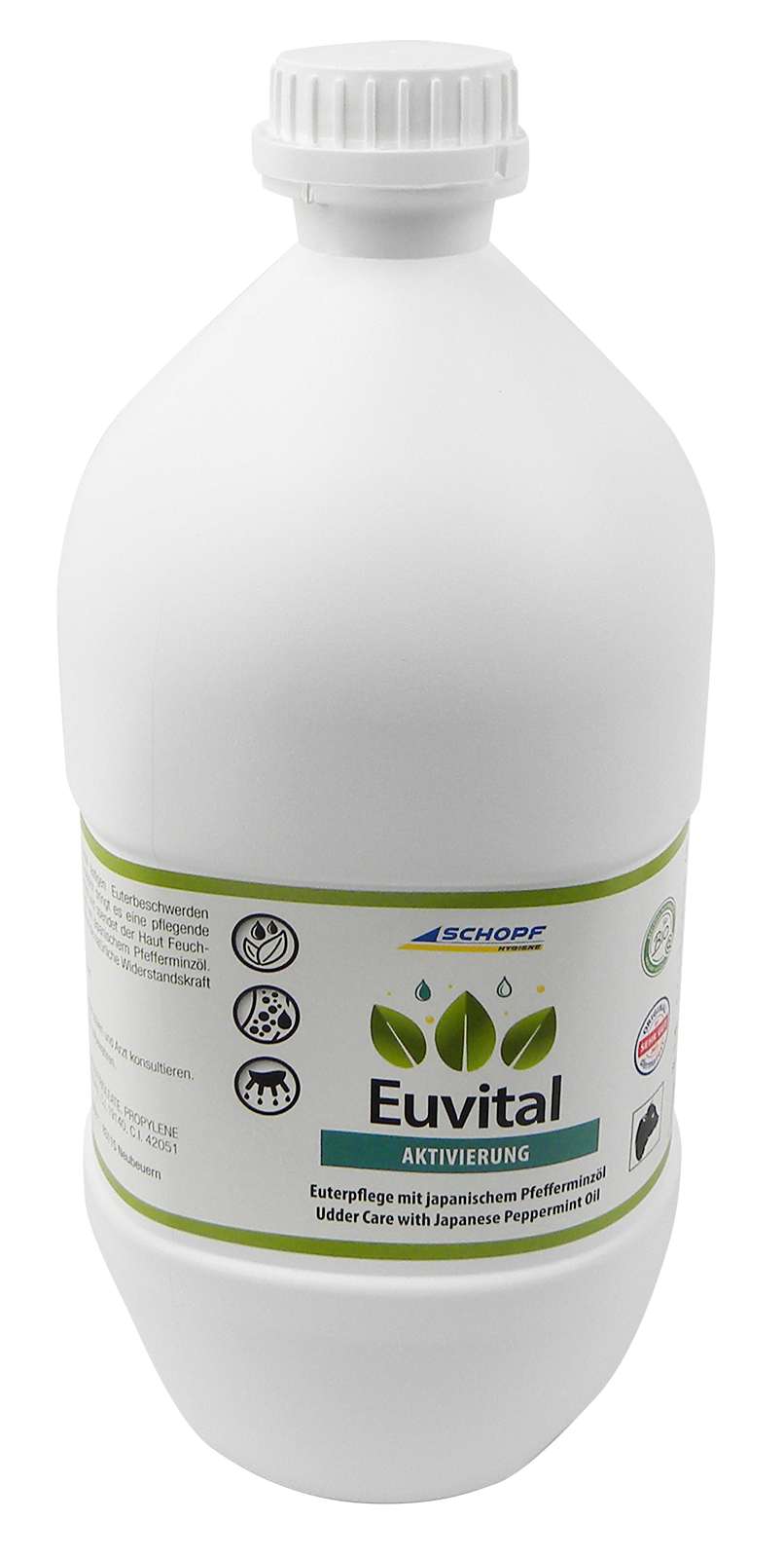 Euvital ist ein natürlicher Euterpflegebalsam auf Basis von japanischem Pfefferminzöl. Aktiviert und beugt lästigen Euterbeschwerden vor. Hautpflegend gegen Risse und Trockenheit. Zusätzlich bringt es eine pflegende Kühle für das Euter. Anwendung: Nach dem Melken die zu behandelnden Euterpartien gründlich einreiben, (ohne Zitze).