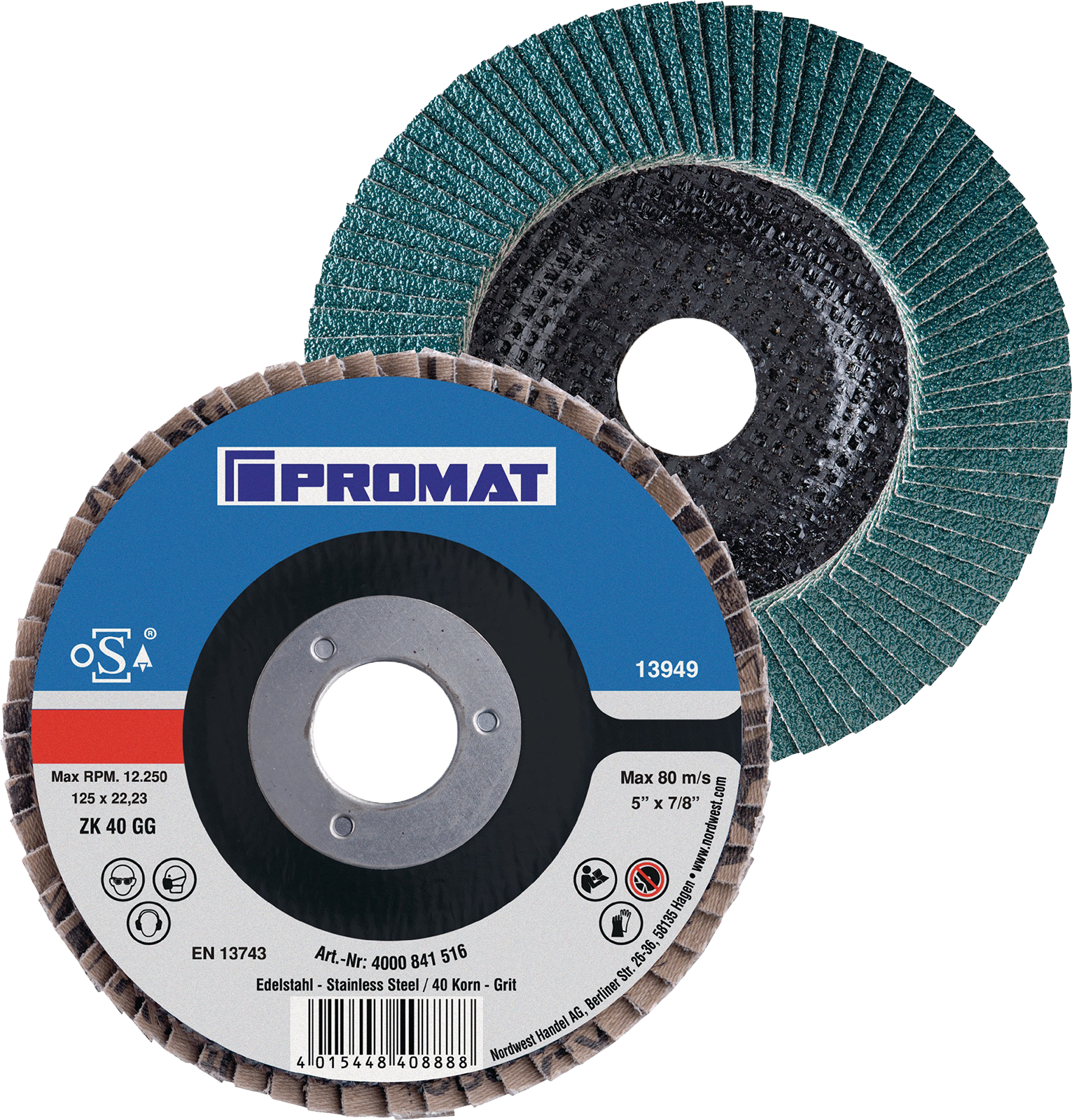 Zirkonkorund, Lamellen schräg. Besonders hohe Zerspanungsleistung und extreme Standzeit bei legierten, unlegierten und vergüteten Stählen, hochfesten NE-Metallen, Edelstahl. Auf Glasgewebeteller. Besonders geeignet für Grob- und Zwischenschliff, zur Bearbeitung von Schweißnähten, Entgraten, Flächenglätten, Entrosten und Gussputzen. Ohne Stützteller zu verwenden. Bohrung 22,23 mm Ø. Weitere technische Eigenschaften: Bohrung 22,23 mm, max. Drehzahl 12200 min⁻¹.