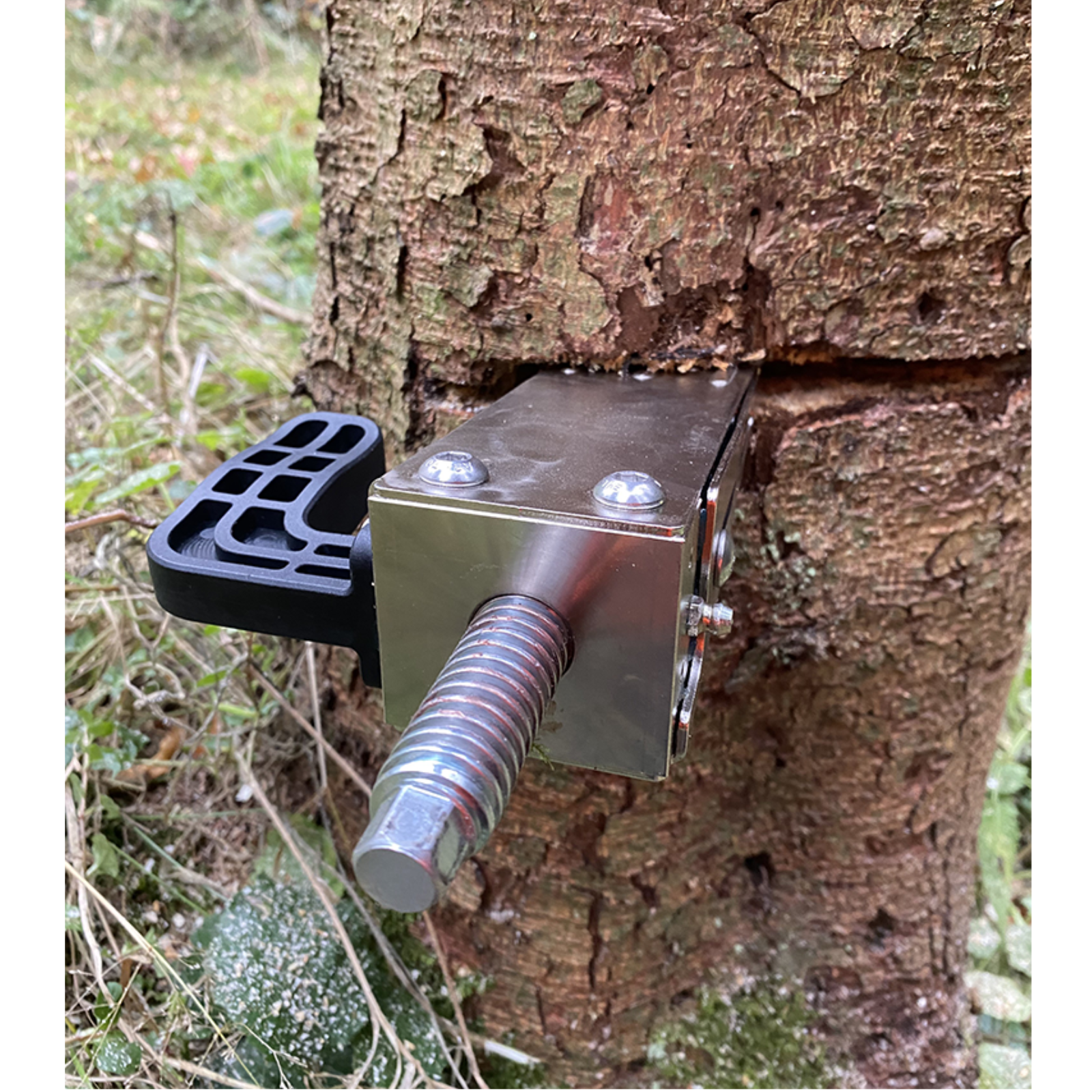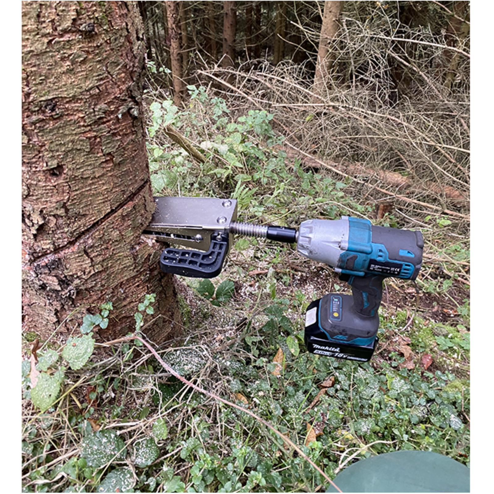 Durch den Einsatz mit einem Akku Schlagschrauber, und das gegenläufige Doppelgewinde wird der Baum besonders rasch gefällt.