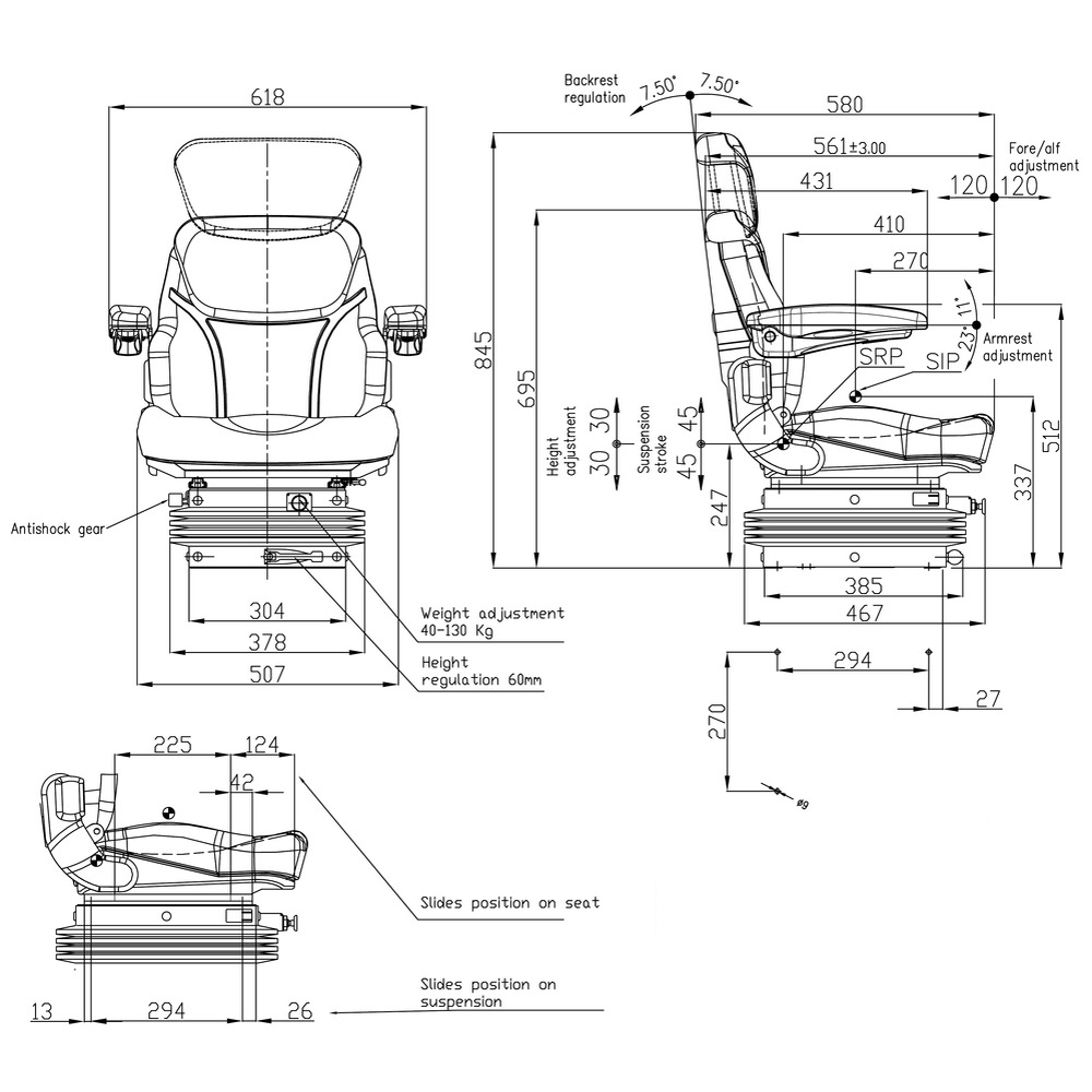 • Breite (ohne Armlehnen): 507 mm, Höhe: 695 - 845 mm, Tiefe: 580 mm