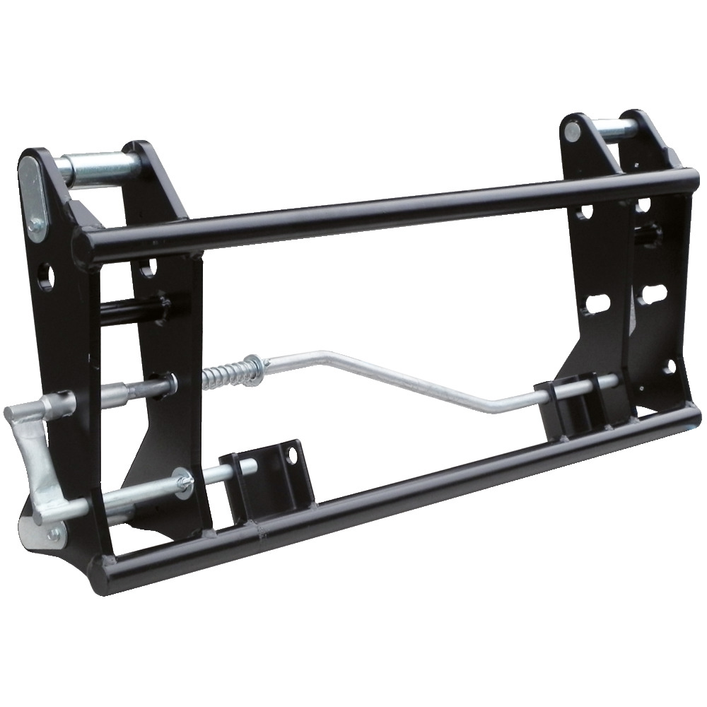 Einfaches und schnelles An- und Abkuppeln für Arbeitsgeräte am Frontlader der Kategorie 2. Die oberen Aufnahmebolzen ermöglichen durch Umstecken eine individuelle Kippwinkelverstellung. Weiters verfügt der Schnellwechselrahmen über eine mechanische Zentralverriegelung. Aufnahmebolzen frontladerseitig 30 mm, Aufnahmewelle geräteseitig 40 mm, Anbaubreite der Frontladerschwinge Innen minimal 860 mm und außen max. 1120 mm, Verriegelungsbolzen-Ø 20 mm, Gesamtbreite 1159 mm, Gewicht 60 kg. Bei einem Lastschwerpunkt von 800 mm beträgt die Tragkraft ca. 3000 kg. Die seitliche Verriegelung kann ganz einfach durch Lösen von 2 Schrauben von der rechten Seite auf die linke Seite umgebaut werden.Der Schnellwechselrahmen in Verbindung mit einer hydraulischen Betätigung ermöglicht einen kostengünstigen Umbau auf einen vollhydraulisch gesteuerten modernen Lader. Dadurch ergibt sich für Ihren alten Frontlader ein umfangreiches neues Einsatzgebiet. Sie erhöhen mit der EURO-Aufnahme die Schlagkraft und weiten die Einsatzmöglichkeit Ihres alten Frontladers um viele Bereiche aus.