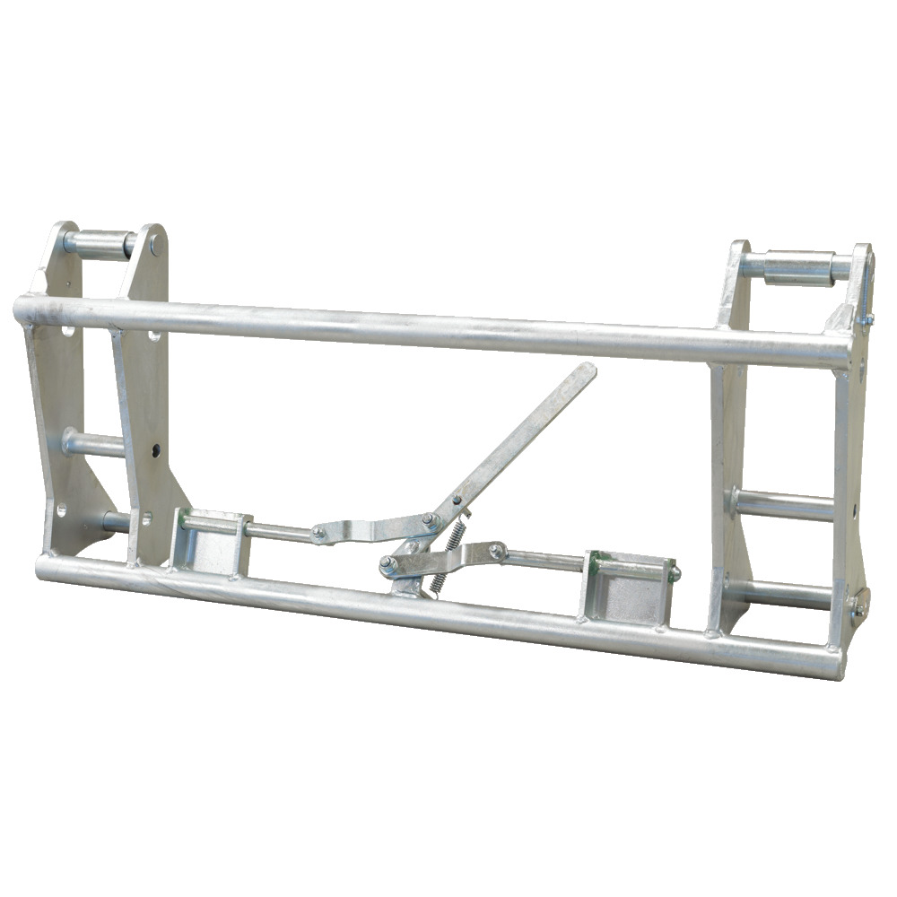 Einfaches und schnelles An- und Abkuppeln für Arbeitsgeräte am Frontlader der Kategorie 2. Die oberen Aufnahmebolzen ermöglichen durch Umstecken eine individuelle Kippwinkelverstellung. Weiters verfügt der Schnellwechselrahmen über eine mechanische Zentralverriegelung. Aufnahmebolzen frontladerseitig 30 mm, Aufnahmewelle geräteseitig 40 mm, Anbaubreite der Frontladerschwinge Innen minimal 860 mm und außen max. 1120 mm, Verriegelungsbolzen-Ø 20 mm, Gesamtbreite 1159 mm, Gewicht 60 kg. Bei einem Lastschwerpunkt von 800 mm beträgt die Tragkraft ca. 3000 kg.Der Schnellwechselrahmen in Verbindung mit einer hydraulischen Betätigung ermöglicht einen kostengünstigen Umbau auf einen vollhydraulisch gesteuerten modernen Lader. Dadurch ergibt sich für Ihren alten Frontlader ein umfangreiches neues Einsatzgebiet. Sie erhöhen mit der EURO-Aufnahme die Schlagkraft und weiten die Einsatzmöglichkeit Ihres alten Frontladers um viele Bereiche aus.