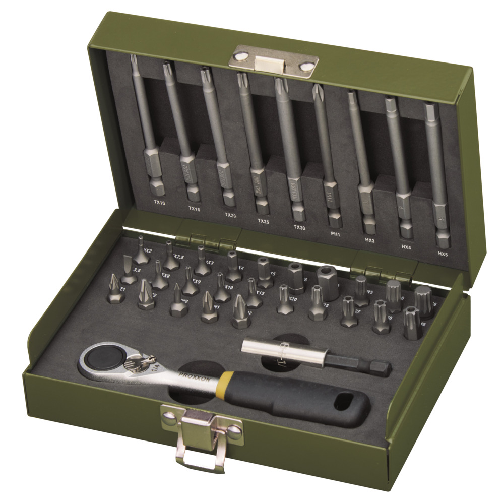 Hochwertiger Werkzeugsatz mit 1/4″MICRO-Bit-Ratsche zur direkten Aufnahme der Bit-Einsätze = handlich und platzsparend für engste Räume. Stabile Metallkassette mit folgendem Inhalt: Ratsche, TTX-Bits 8,9,10,15,20,25,27,30 und 40 kurz (25 mm),10,15,20, 25, 30 lang (80 mm), Inbus 2,2,5,3,4,5,6,8 kurz, 3,4,5 lang, Vielzahn 5,6,8, PH 0,1,2 und Gr1 lang, PZ 1, 2 , und Flach Breite 3,5mm sowie Bit Adapter für Bohrmaschine.