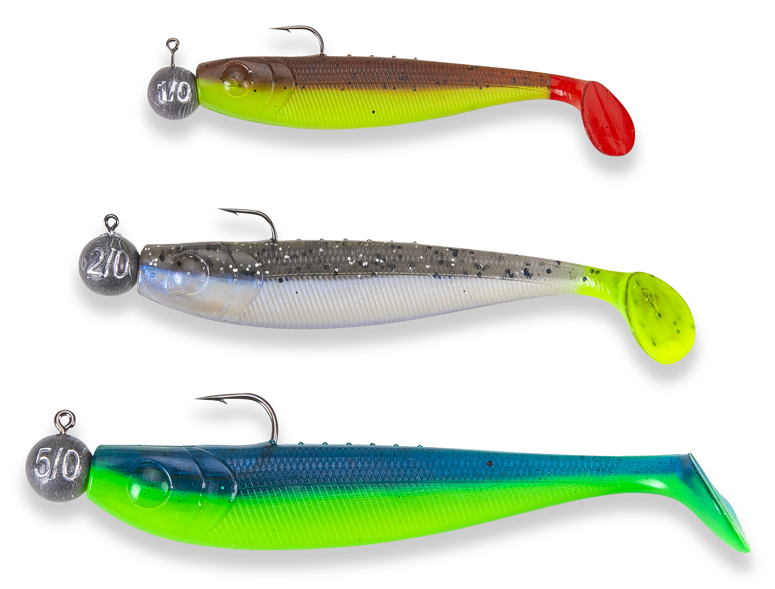 Dieses Set, inkl. Jighead, ist fertig montiert, im Set befinden sich 3 unterschiedliche Farben. Einfach aus der Verpackung nehmen, am Vorfach anbringen und losfischen. Der Köder reagiert auf den geringsten Zug und verführt den Fisch schon beim Absinken zum Anbeißen. Größe: 15 cm, Gewicht 18,0 g. Hakengr. 5/0