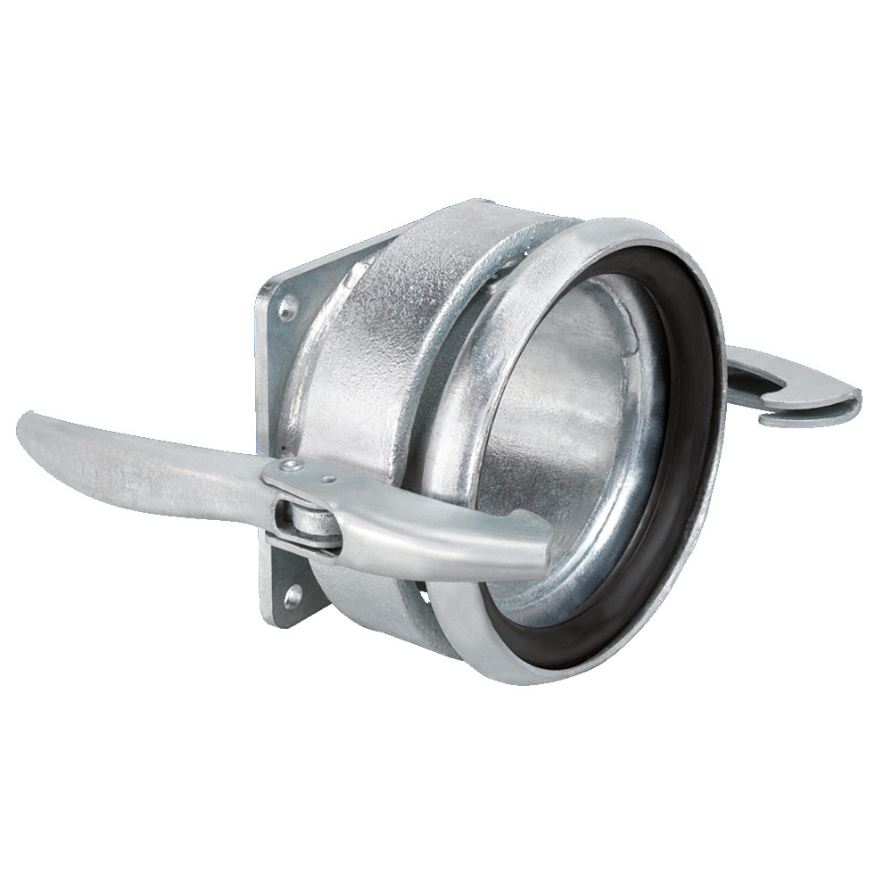 Flanschkupplung Becher mit Hebelverschlussring und Gummiring. Verzinkte Ausführung, Stutzenlänge 150 mm.Lochbild Flanschanschluss: 150 x 150 mm