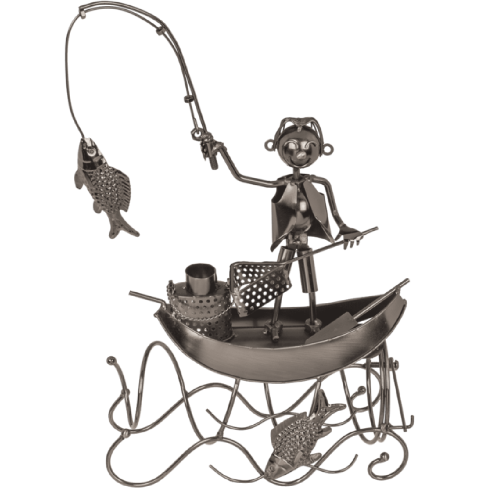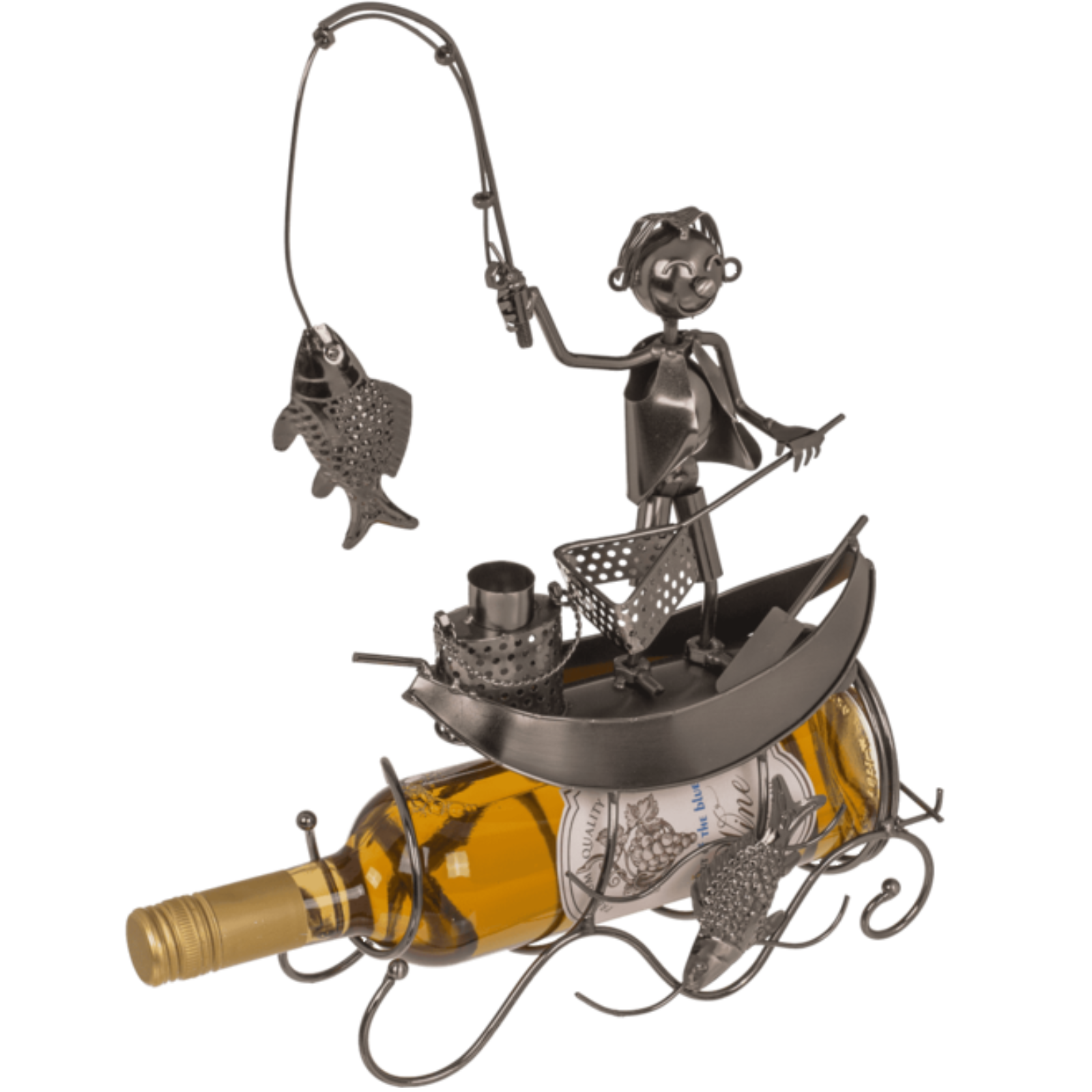 Flaschenhalter „Fischer“ aus Metall – Das perfekte Geschenk für AngelfreundeDieser dekorative Flaschenhalter in Form eines Fischers ist ein echter Blickfang und ein originelles Geschenk für alle, die das Angeln lieben.Gefertigt aus Metall überzeugt er durch liebevolle Details – vom Kescher bis zur Rute.Er bietet Platz für eine Wein- oder Sektflasche (nicht enthalten) und macht als Tischdeko oder Präsent richtig Eindruck.Ob zum Geburtstag, Vatertag oder als Mitbringsel für den nächsten Angelabend – dieser Halter verbindet Humor mit Funktion.Ein Geschenk, das garantiert für Freude sorgt!Maße: ca. 25 x 12 x 27 cm