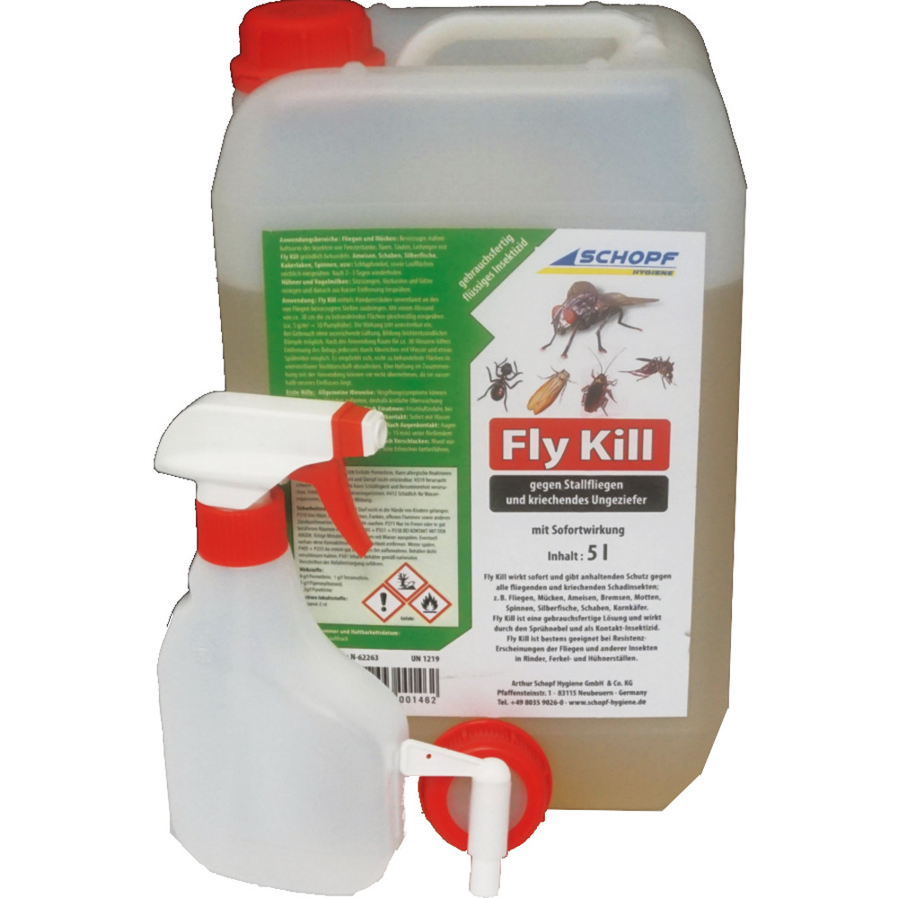 Anwendung: Fly Kill mittels Handzerstäuber unverdünnt an den von Fliegen bevorzugten Stellen ausbringen. Mit einem Abstand von ca. 30 cm die zu behandelnden Flächen gleichmäßig einsprühen (ca. 5 g/m² ≈ 10 Pumphübe). Die Wirkung tritt unmittelbar ein. Inhalt: 5 l Kanister mit Sprühflasche. Hinweise: Darf nicht auf Acrylleitungen gesprüht werden. Wirkstoff: Permethrin, Pyrethrine, Tetramethrin, Piperonylbutoxid. *Biozidprodukte vorsichtig verwenden. Vor Gebrauch stets Etikett und Produktinformationen lesen.